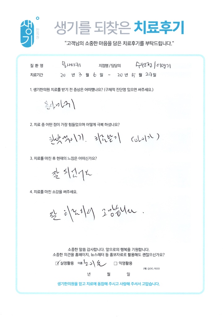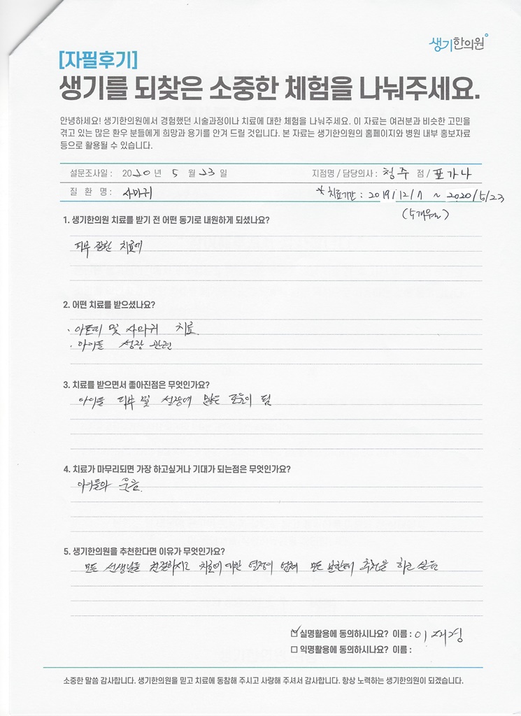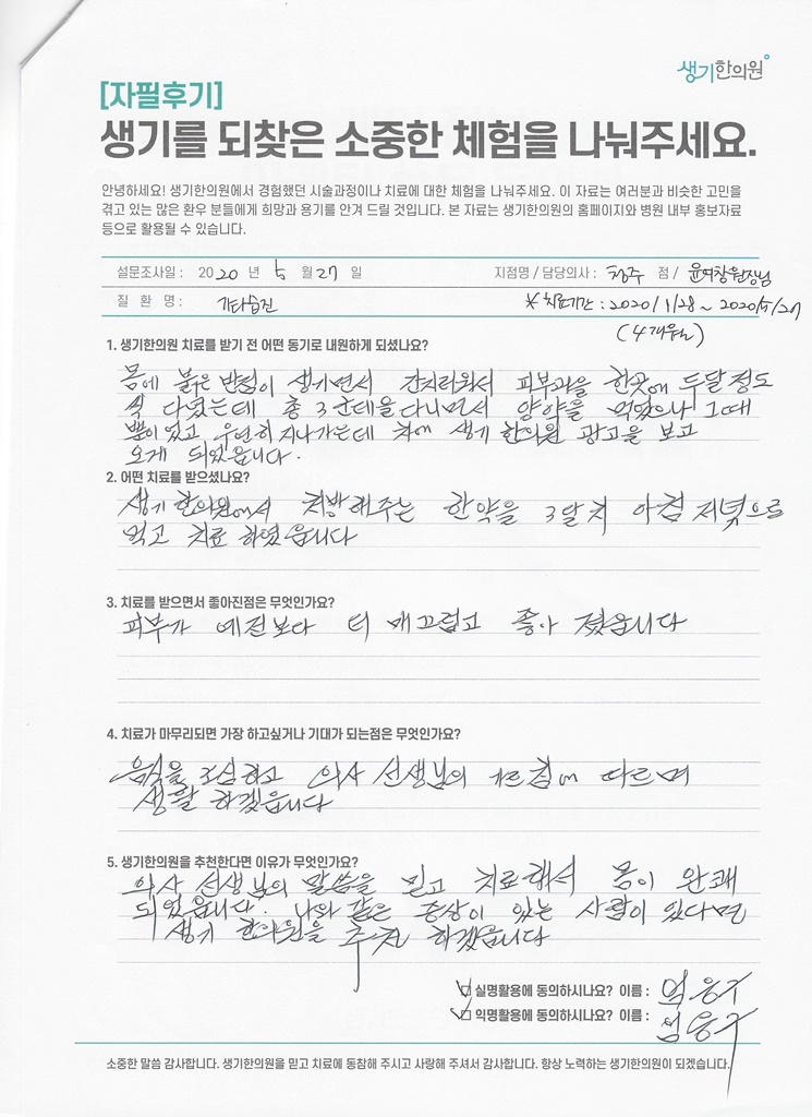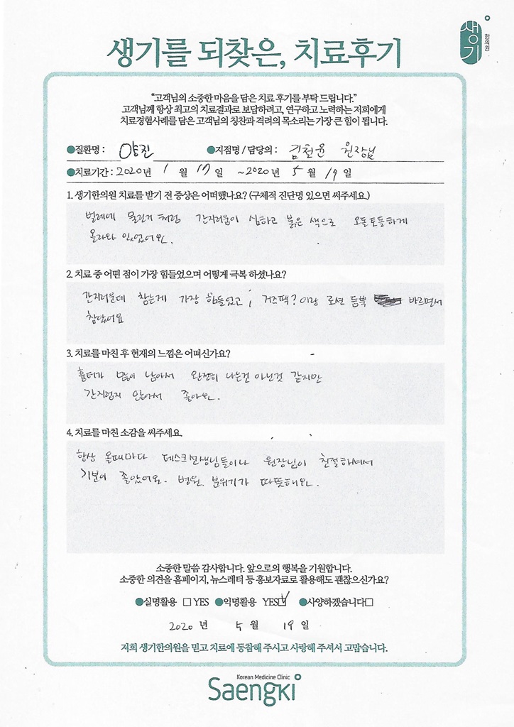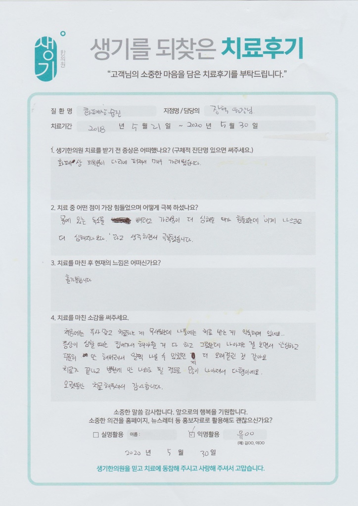 생기한의원과 함께하신 생생한 자필 및 영상 후기를 소개합니다.