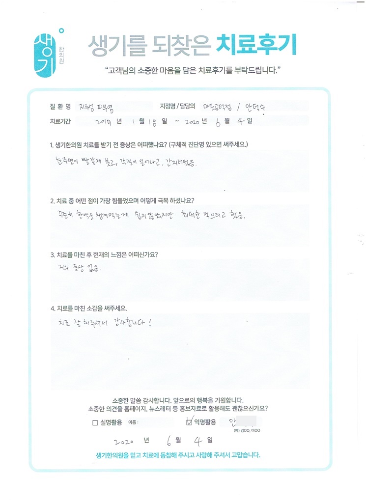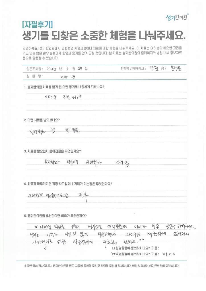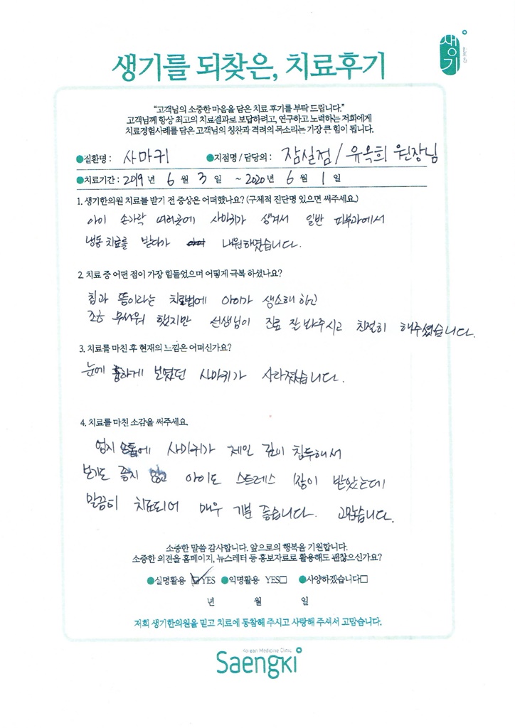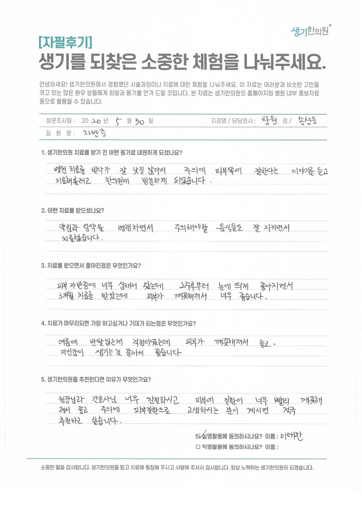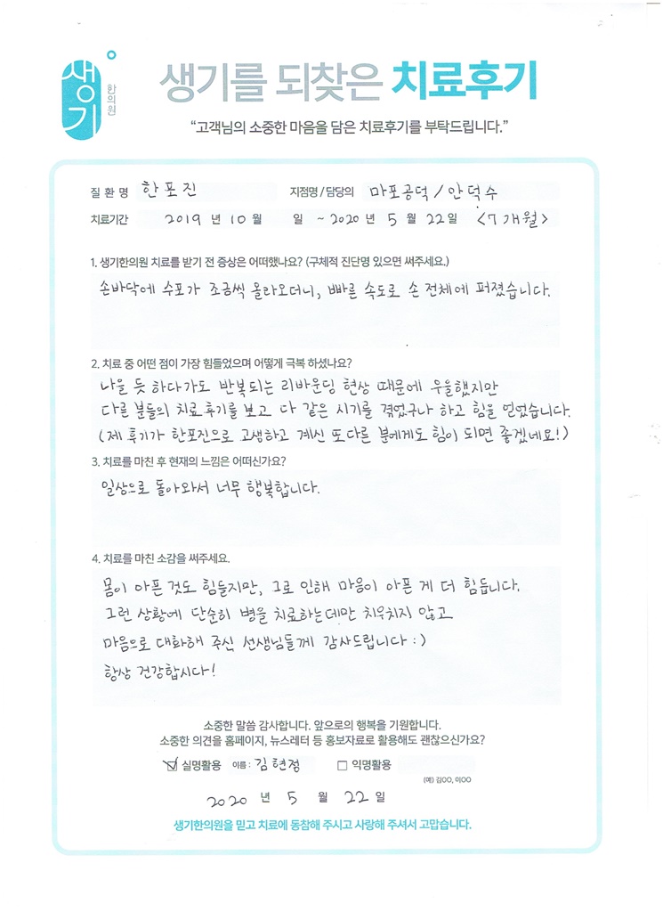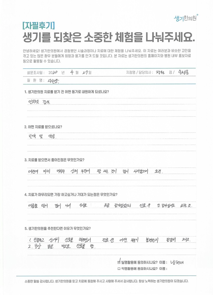 생기한의원과 함께하신 생생한 자필 및 영상 후기를 소개합니다.
