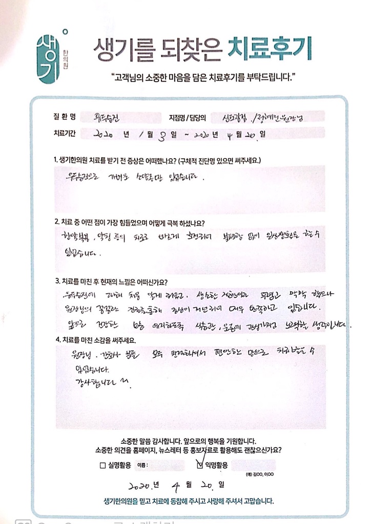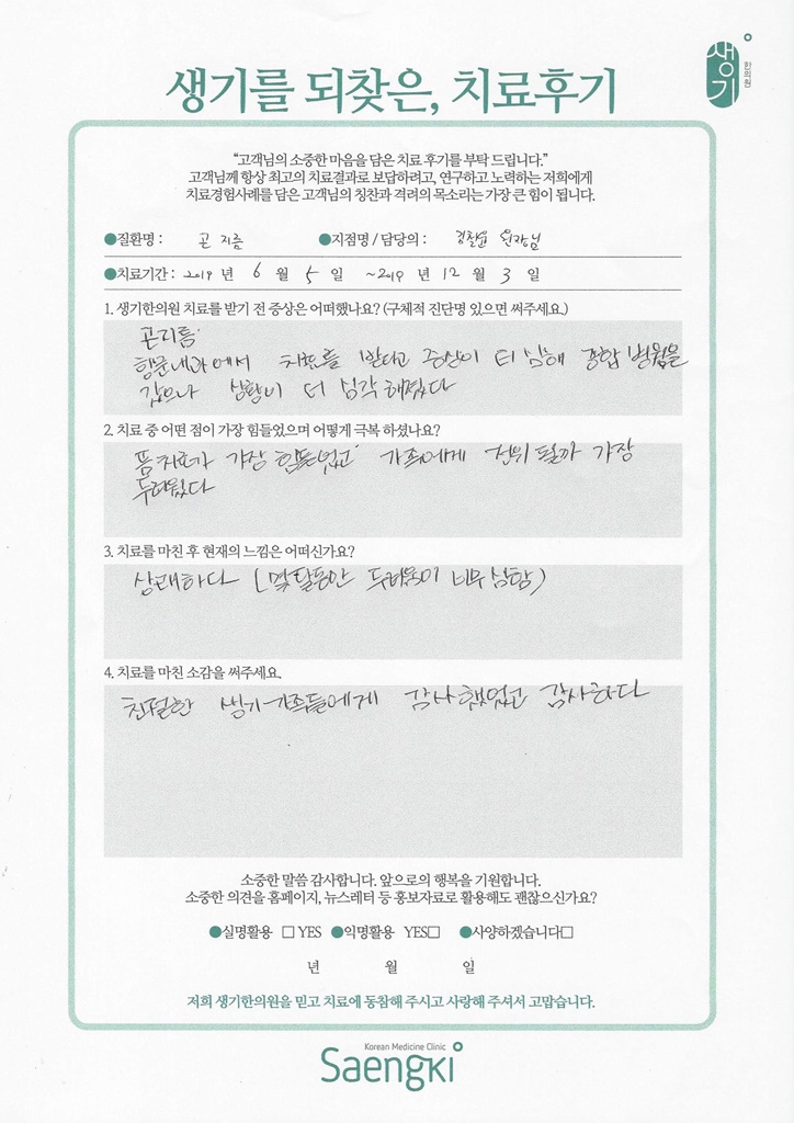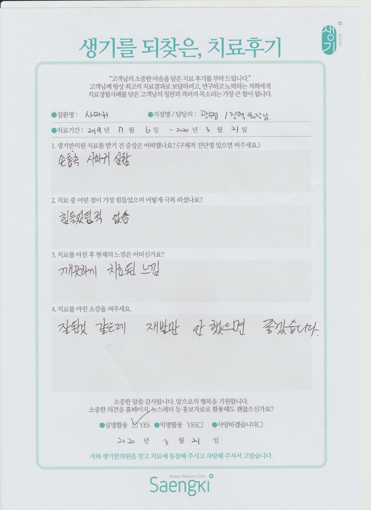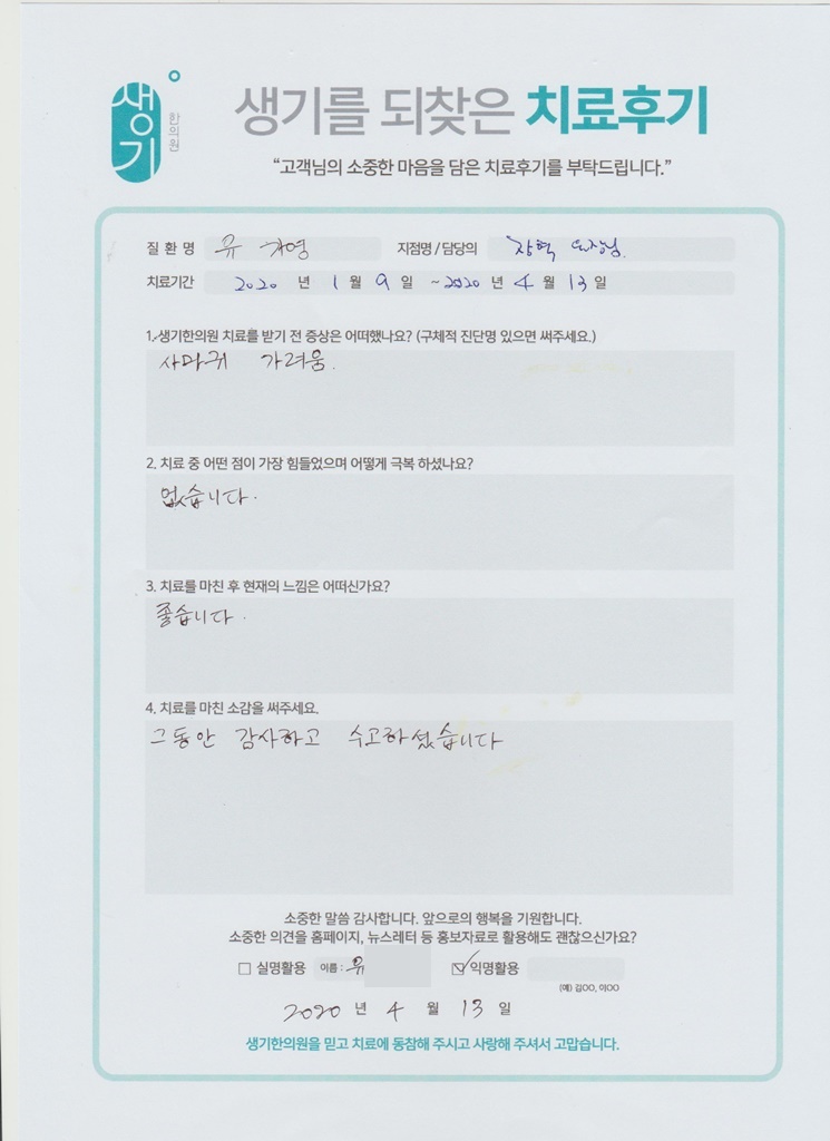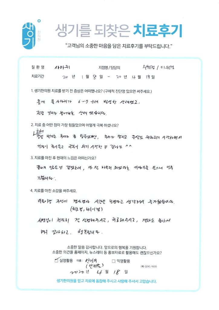 생기한의원과 함께하신 생생한 자필 및 영상 후기를 소개합니다.