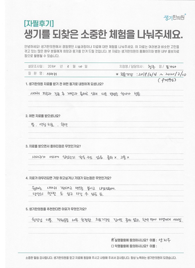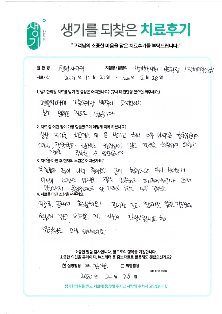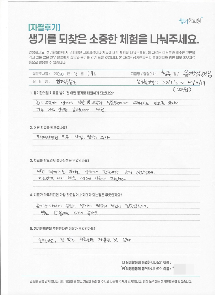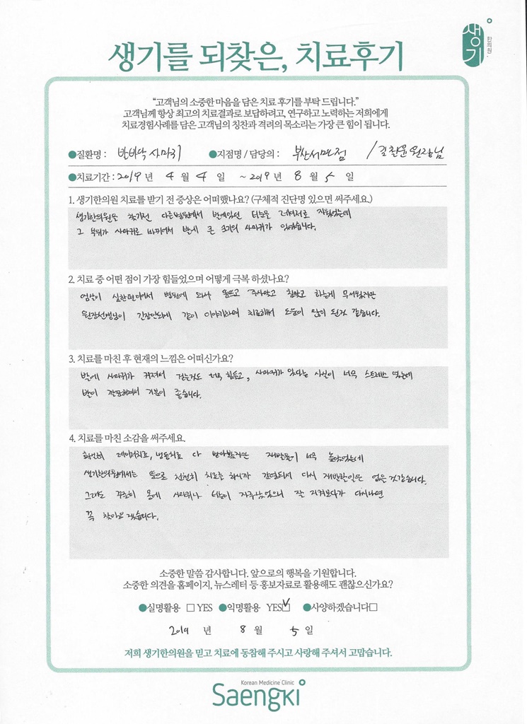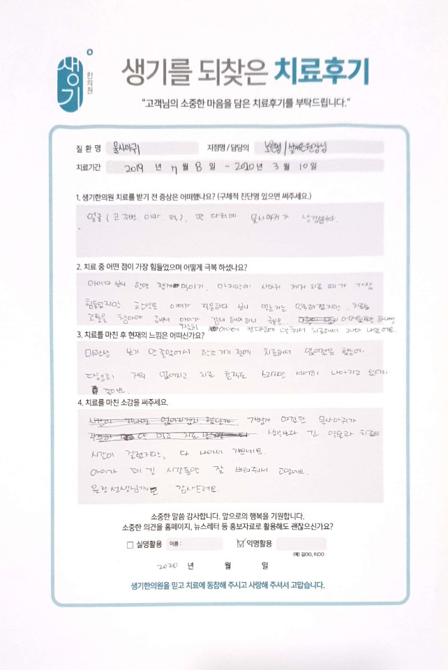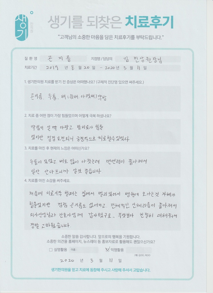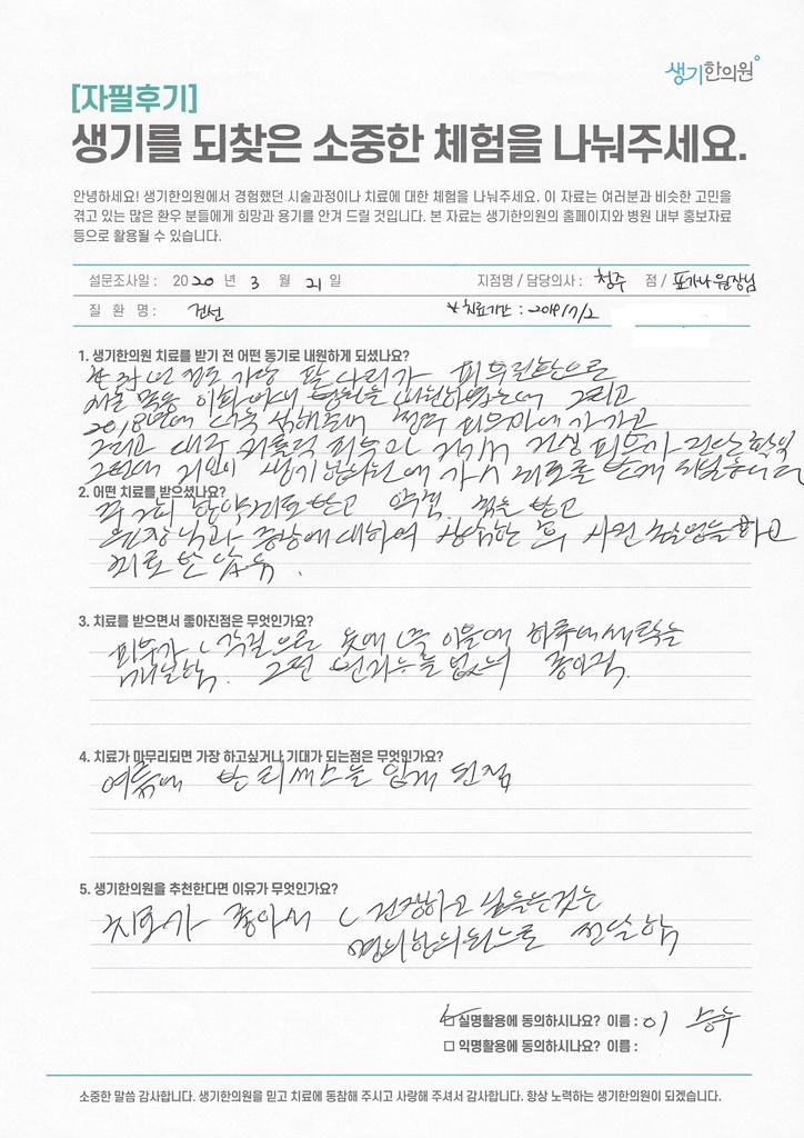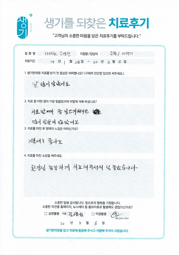 생기한의원과 함께하신 생생한 자필 및 영상 후기를 소개합니다.