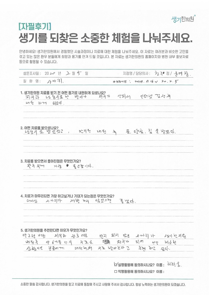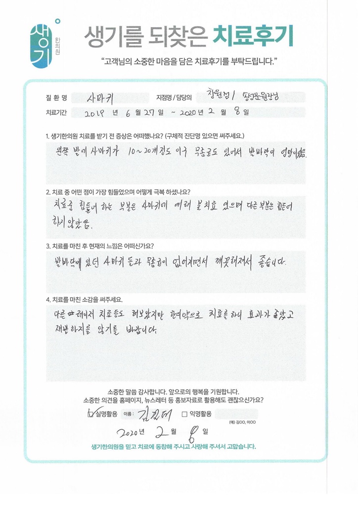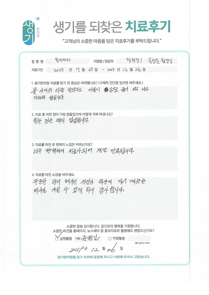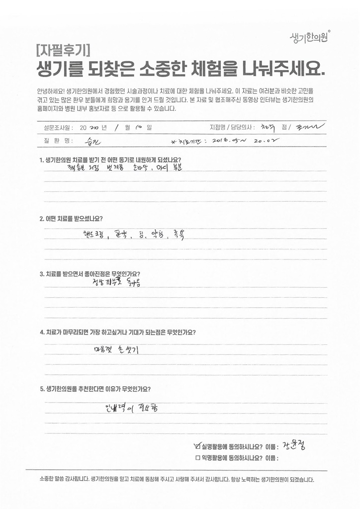 생기한의원과 함께하신 생생한 자필 및 영상 후기를 소개합니다.