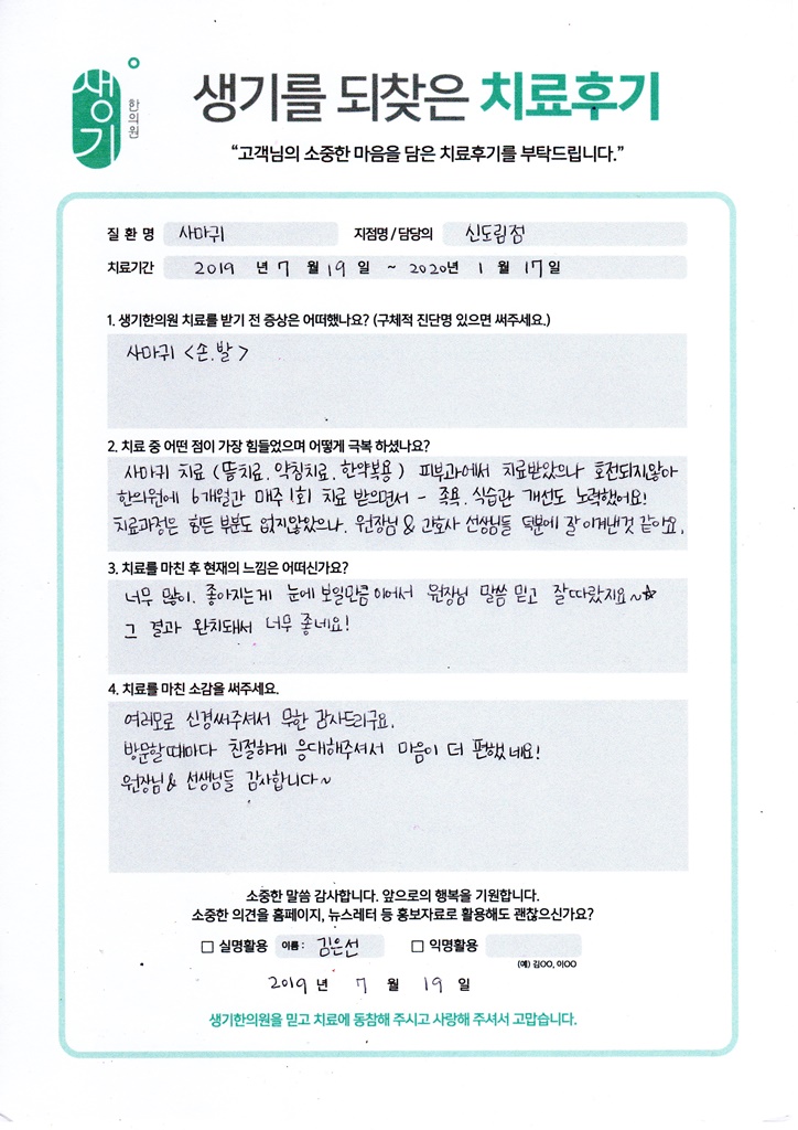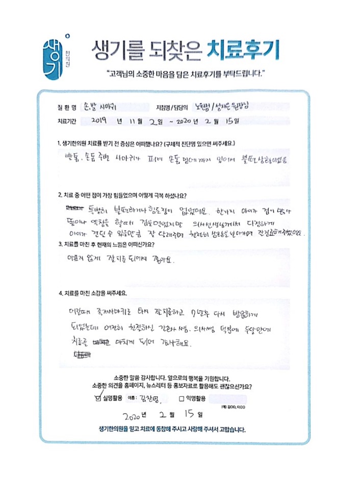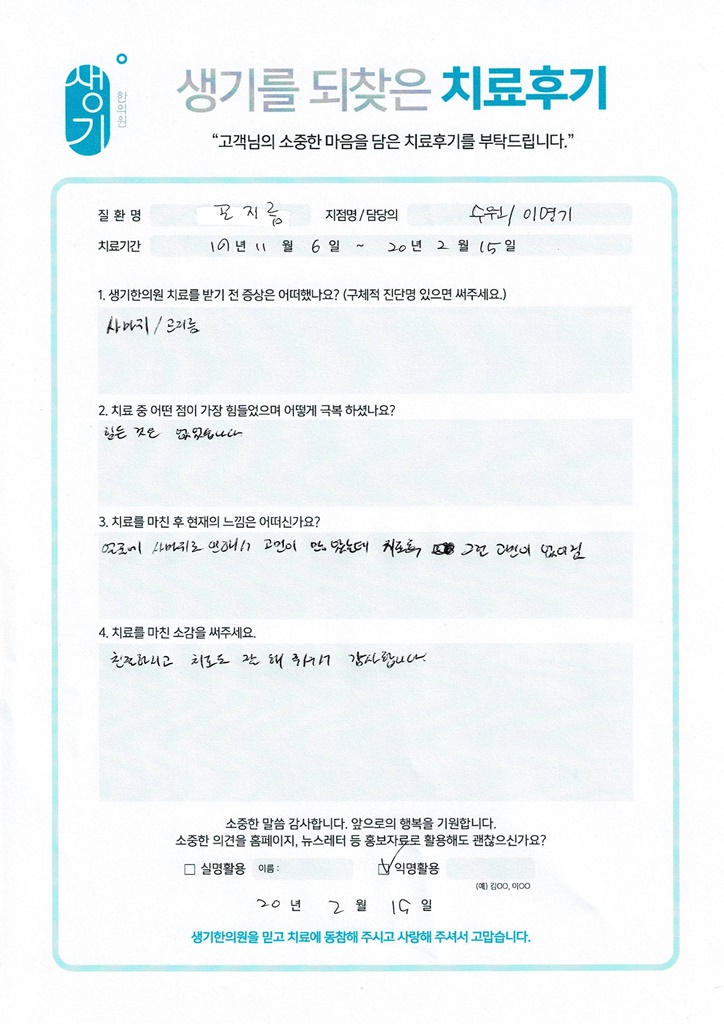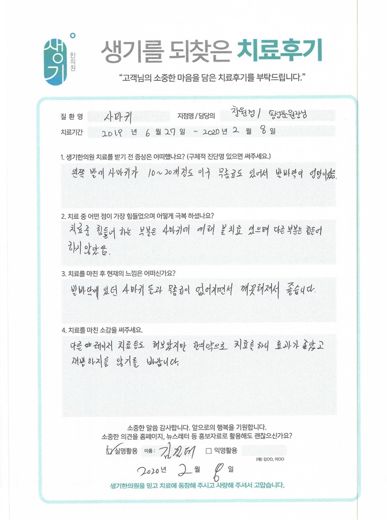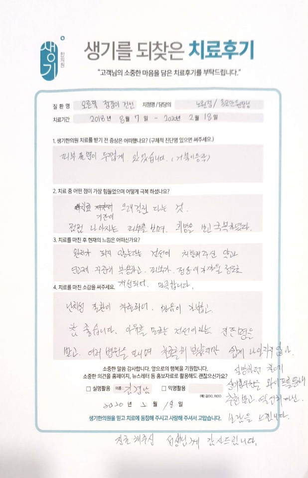 생기한의원과 함께하신 생생한 자필 및 영상 후기를 소개합니다.