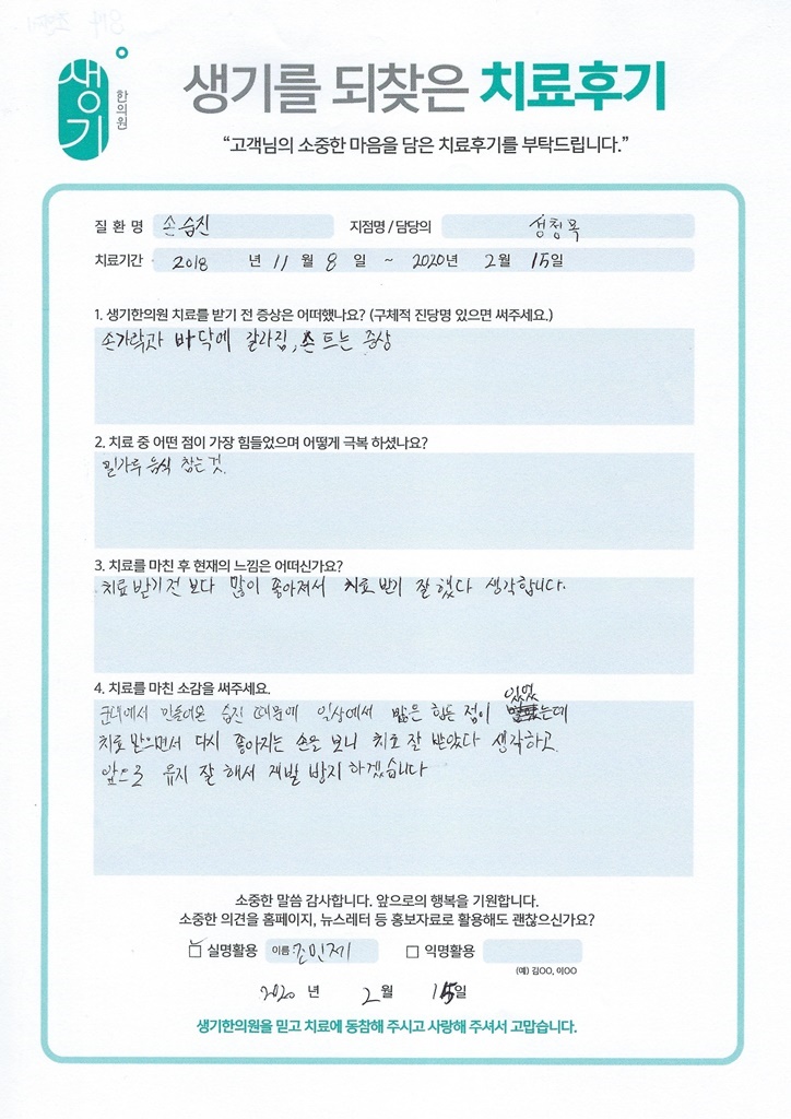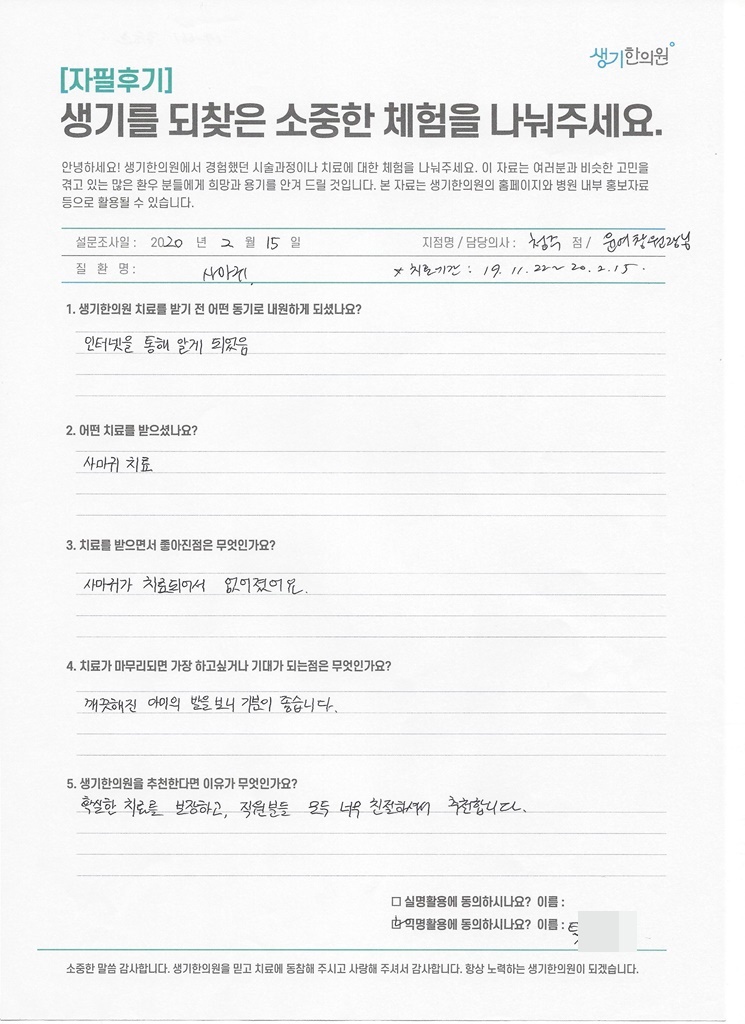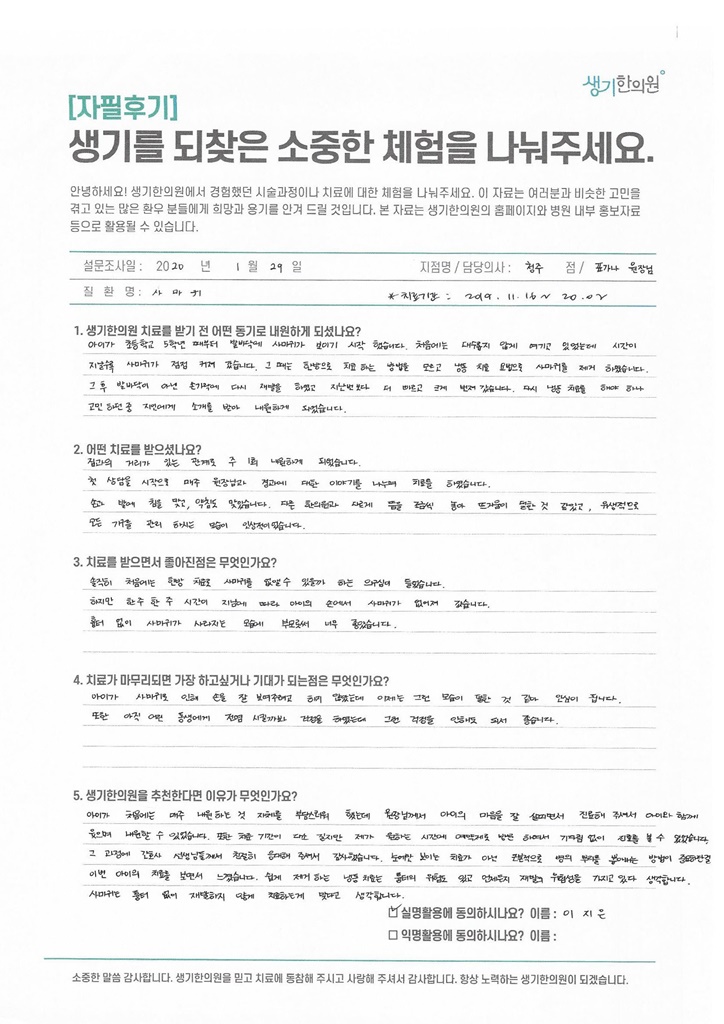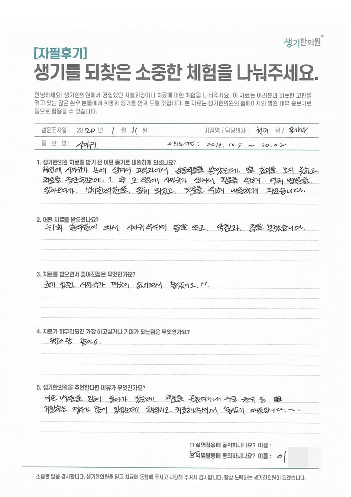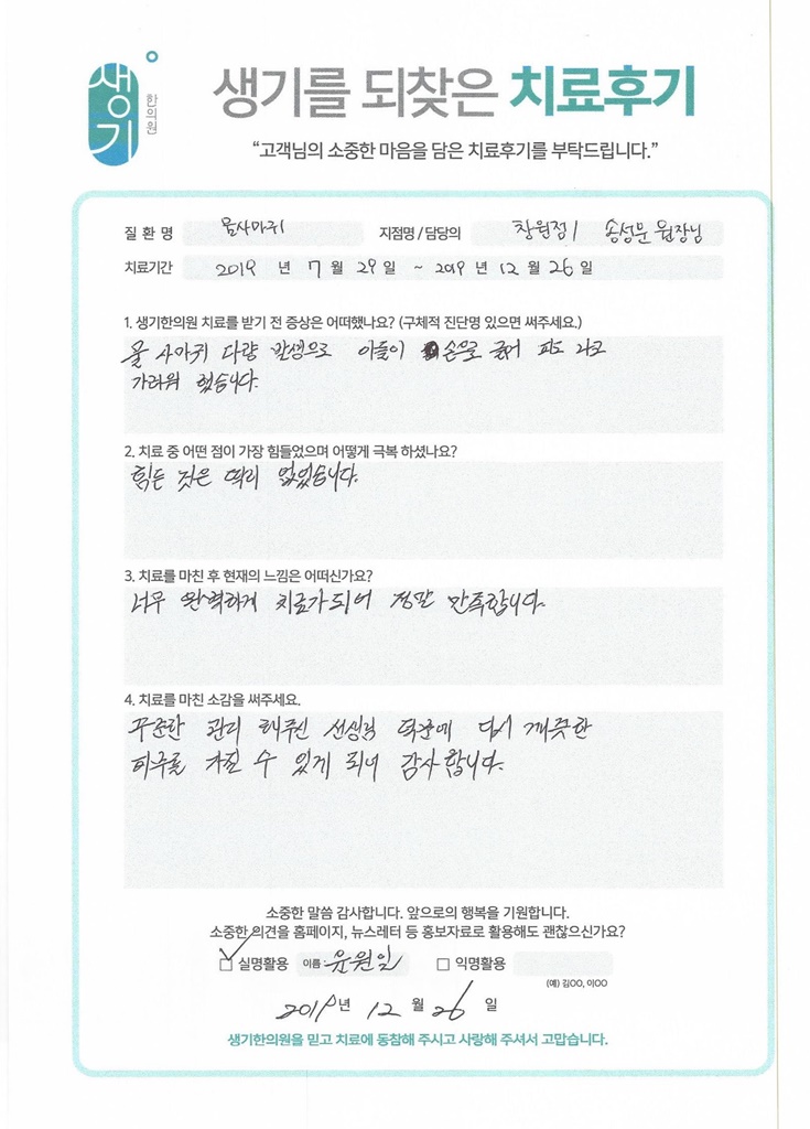 생기한의원과 함께하신 생생한 자필 및 영상 후기를 소개합니다.