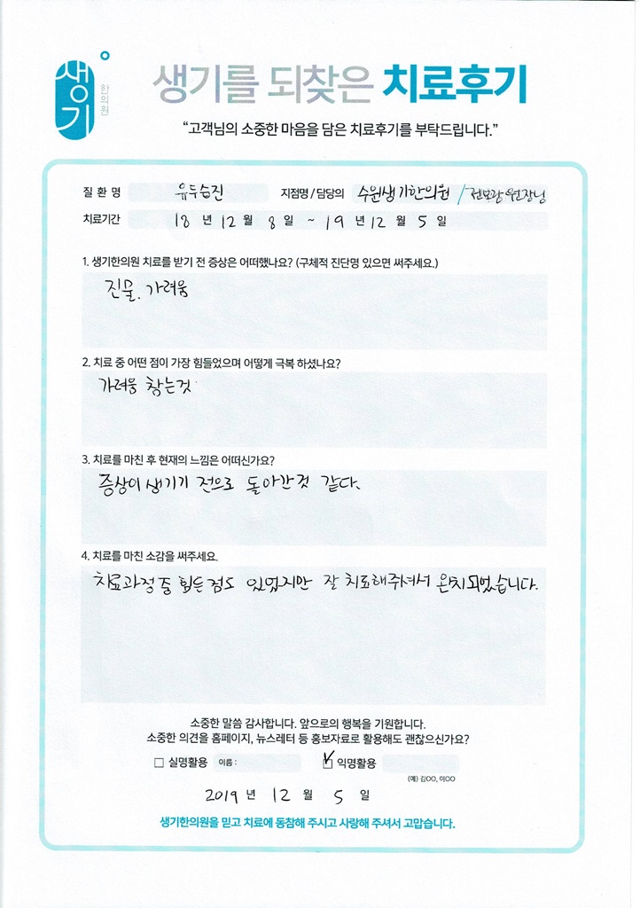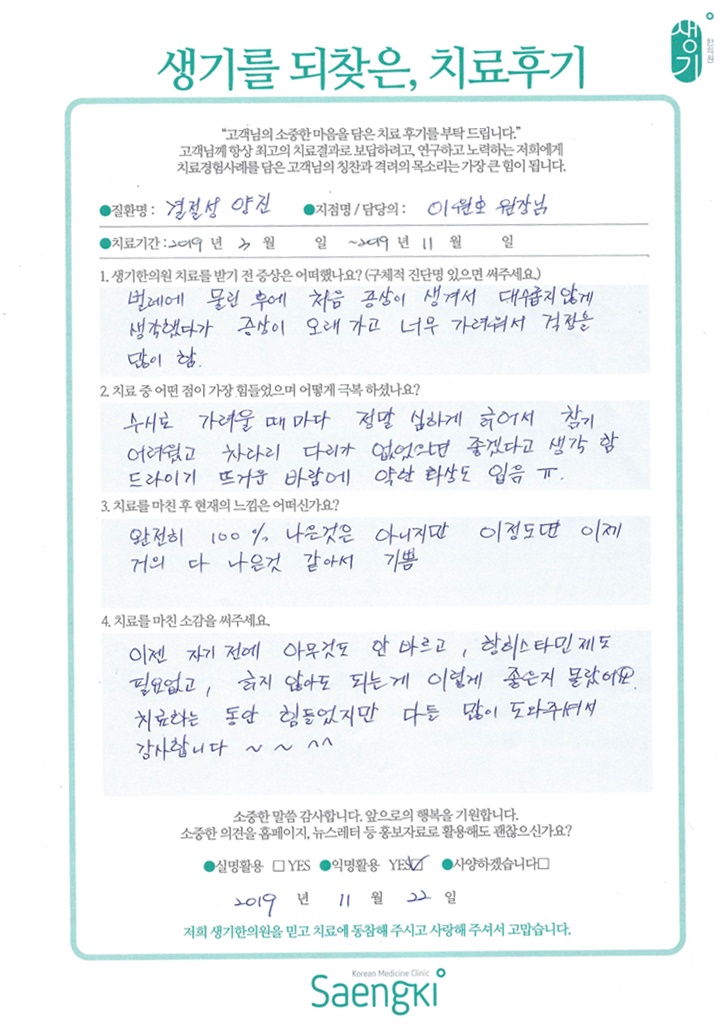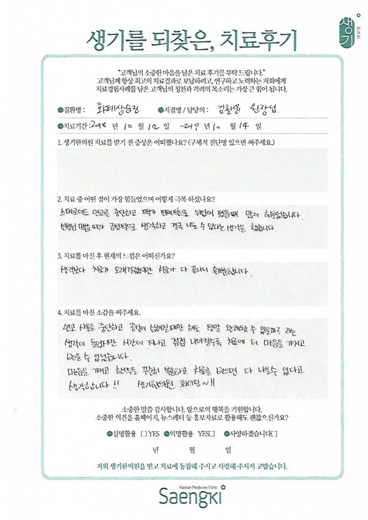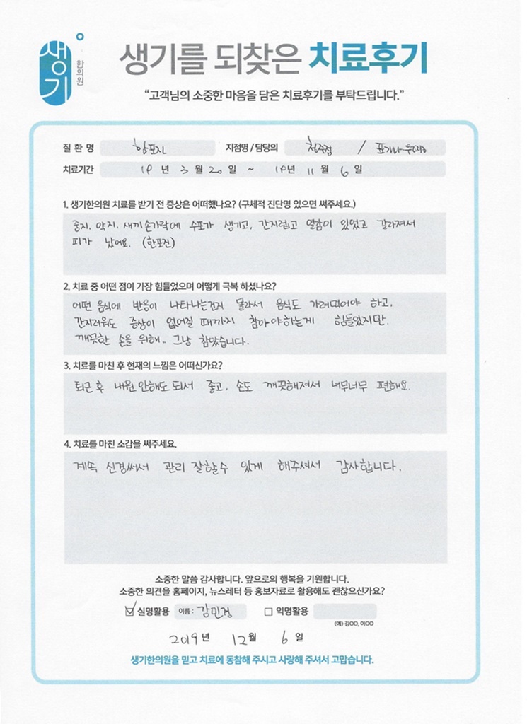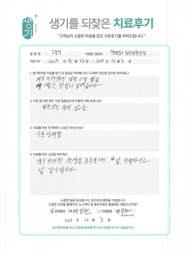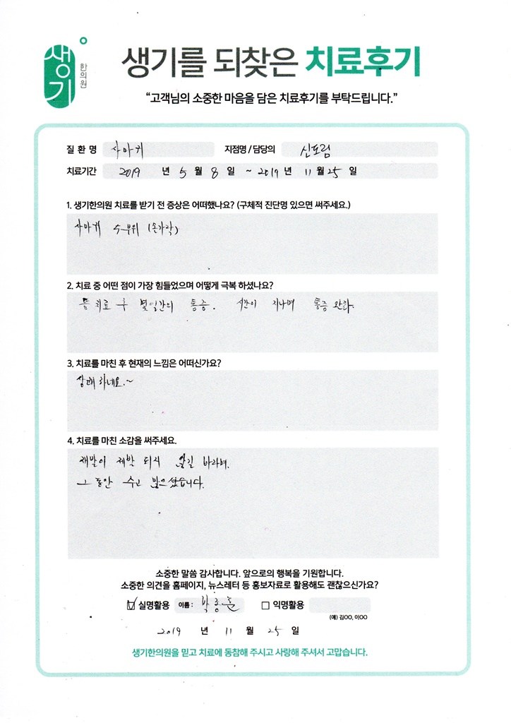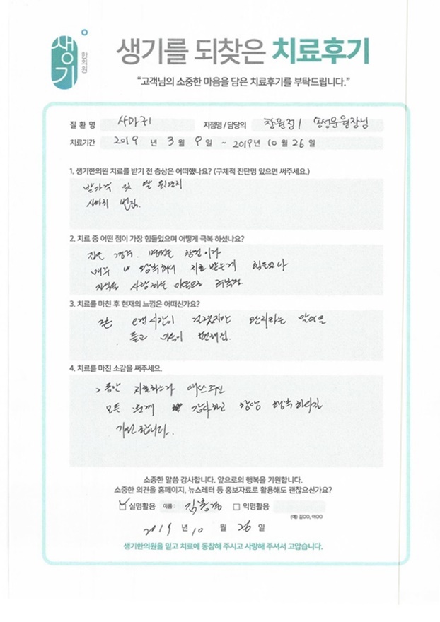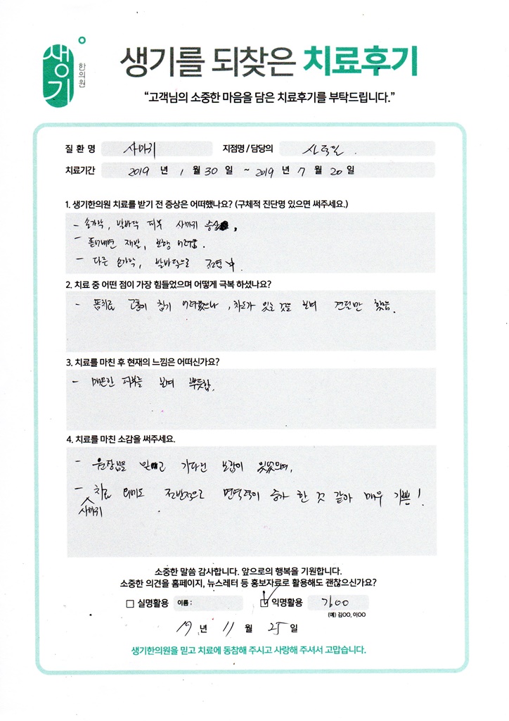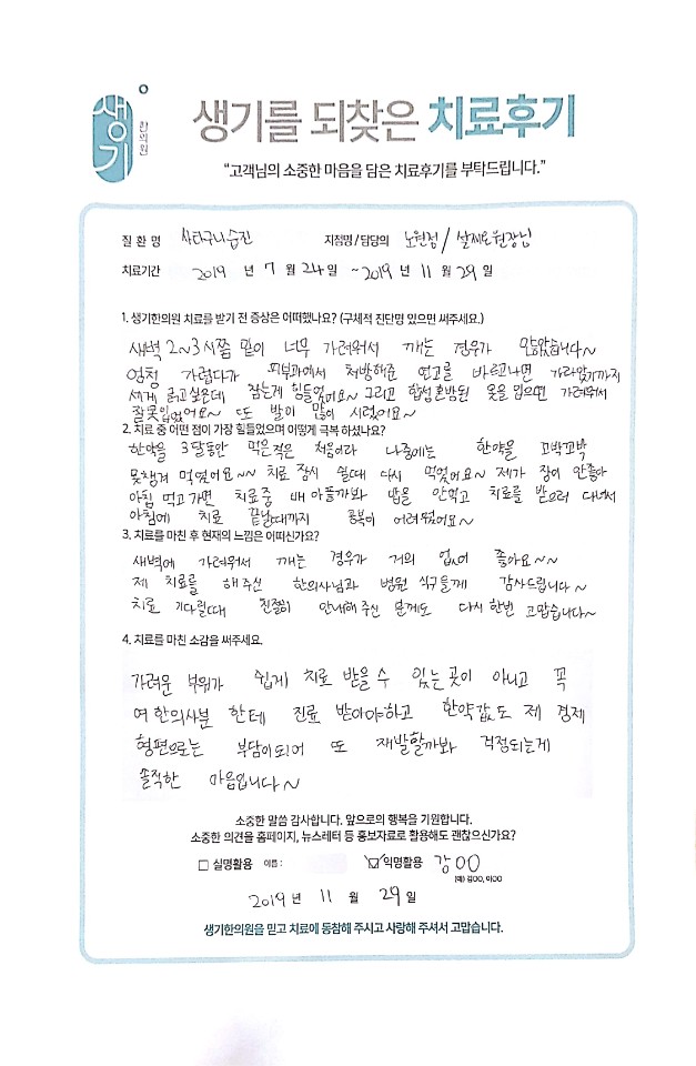 생기한의원과 함께하신 생생한 자필 및 영상 후기를 소개합니다.