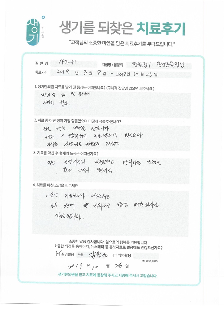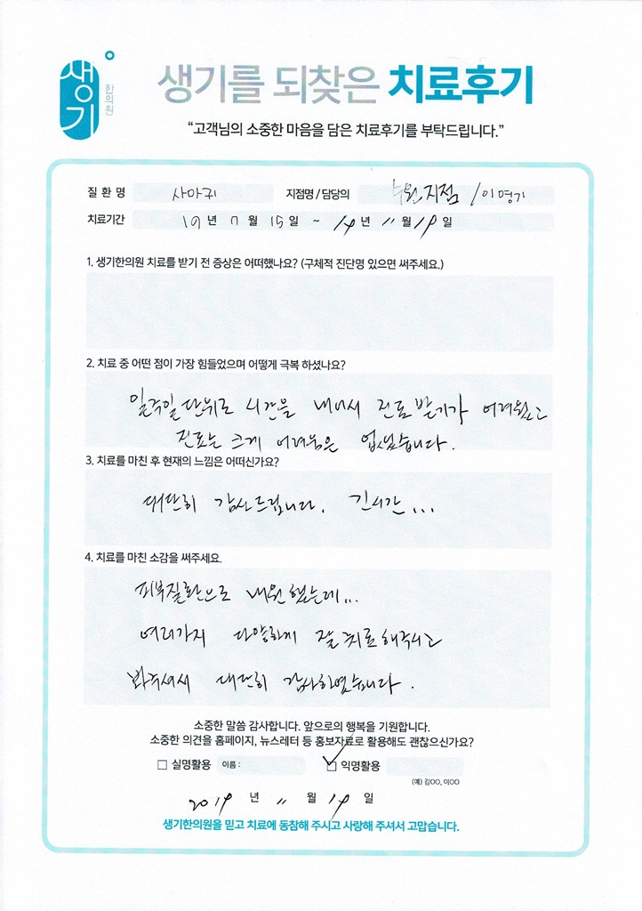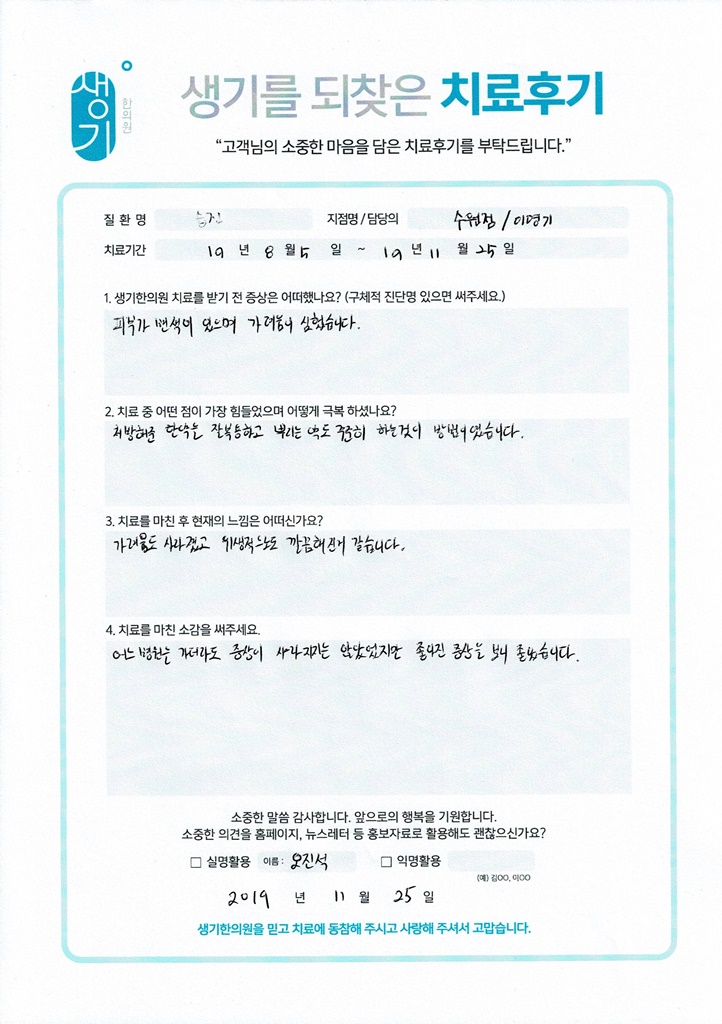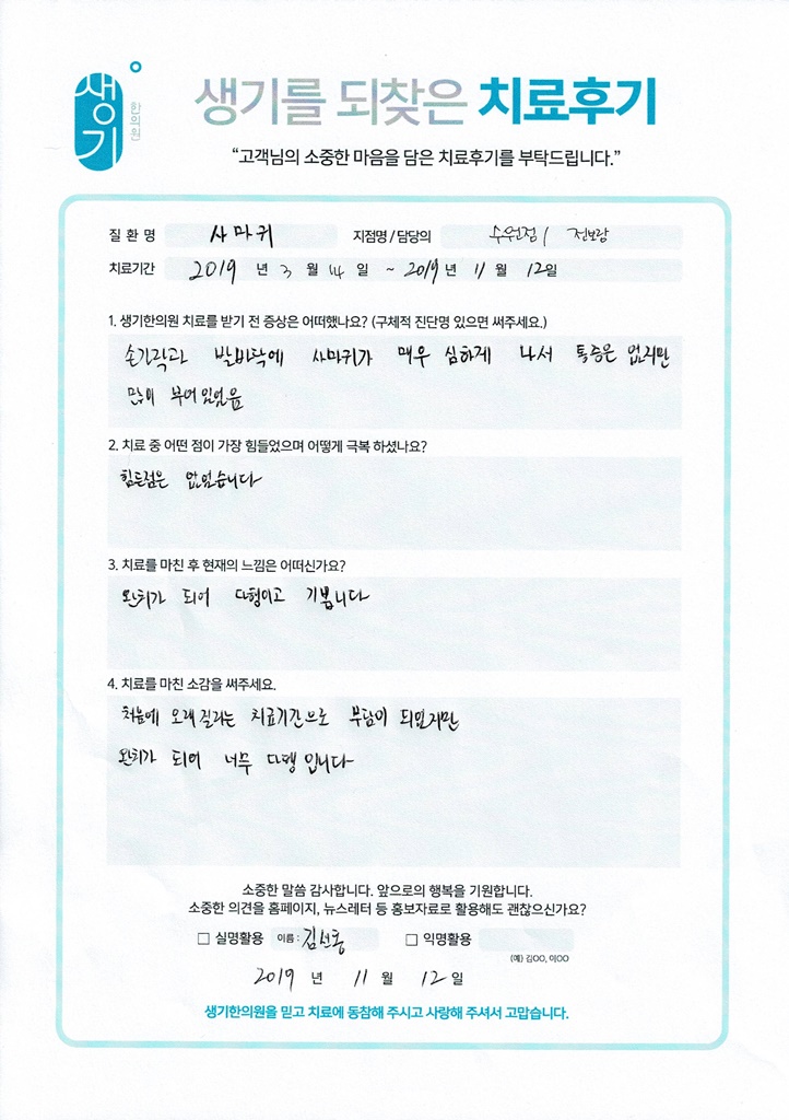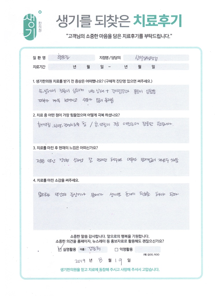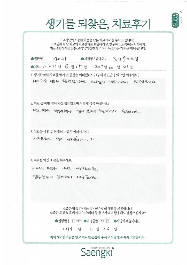 생기한의원과 함께하신 생생한 자필 및 영상 후기를 소개합니다.