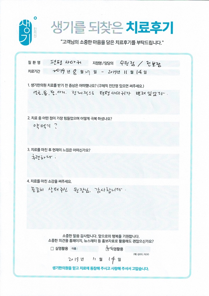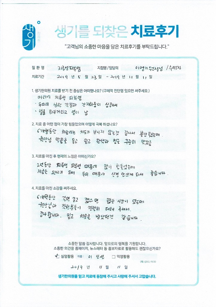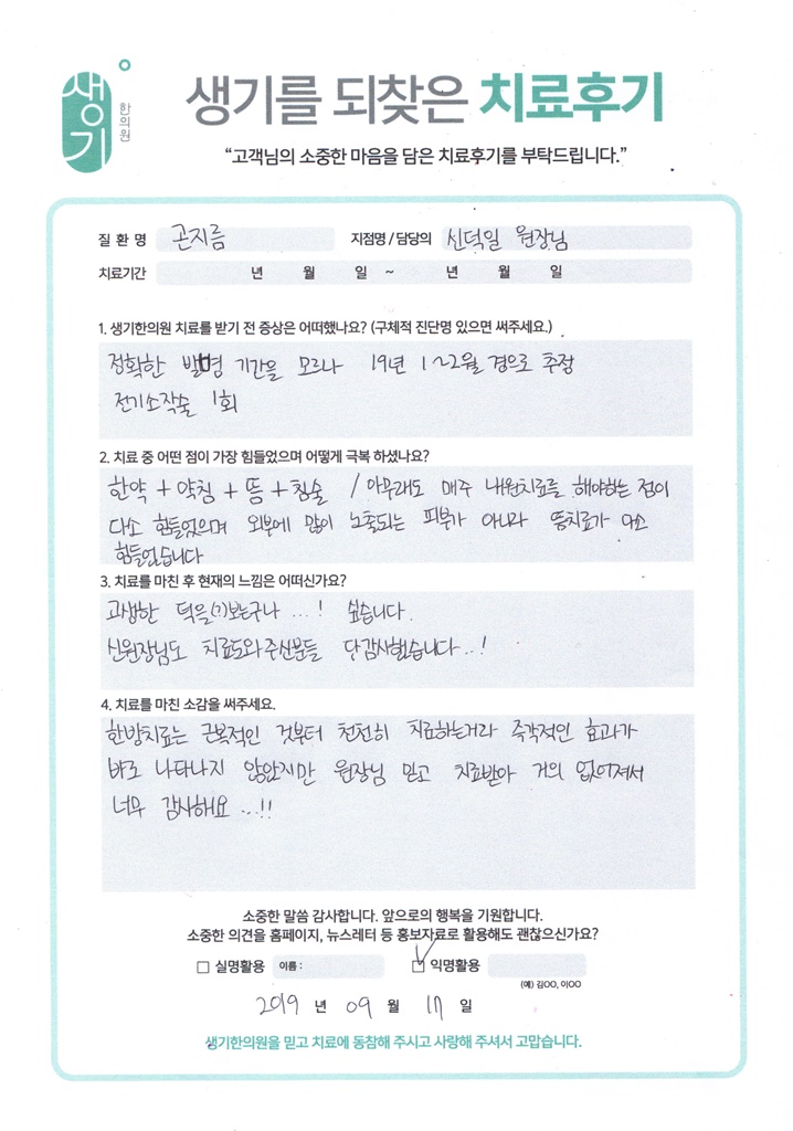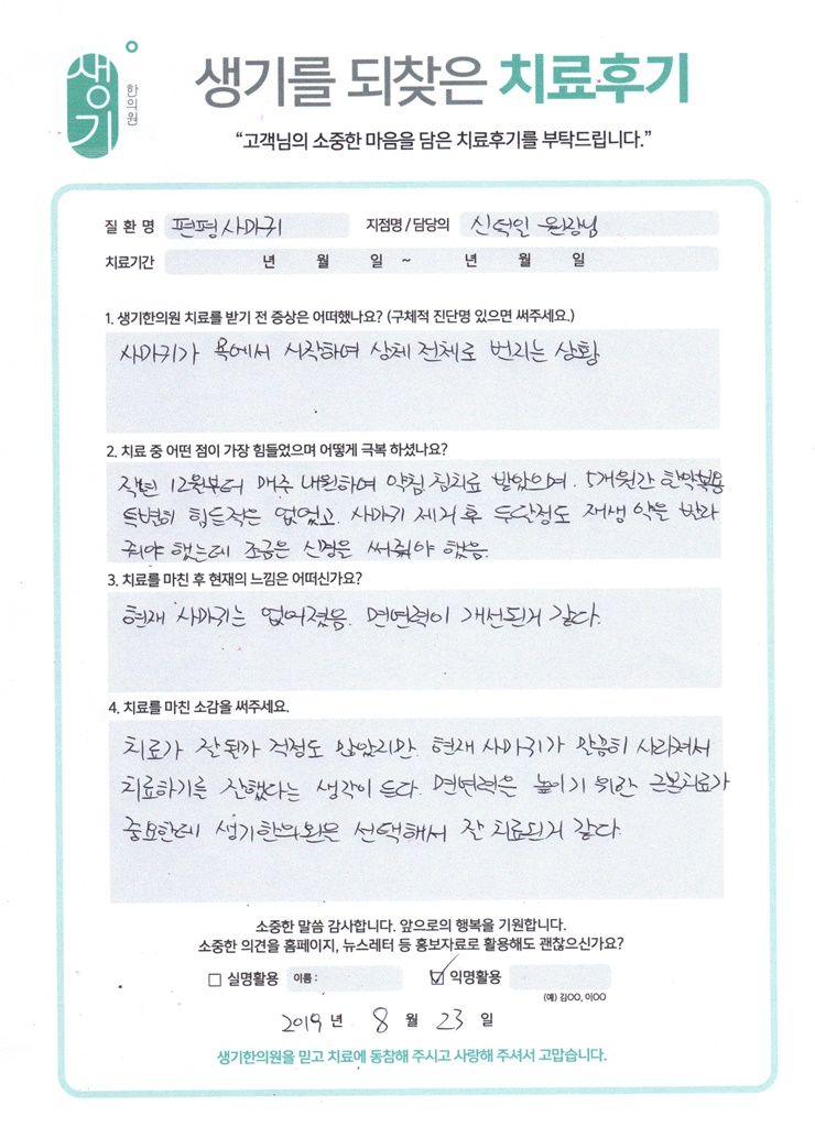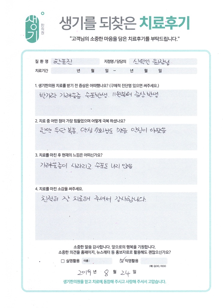 생기한의원과 함께하신 생생한 자필 및 영상 후기를 소개합니다.