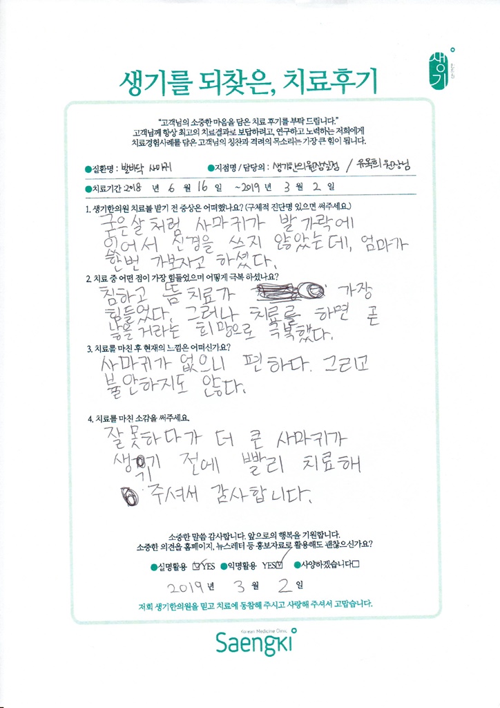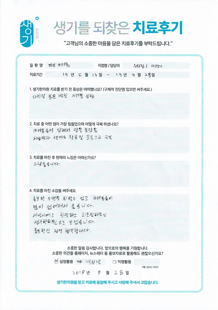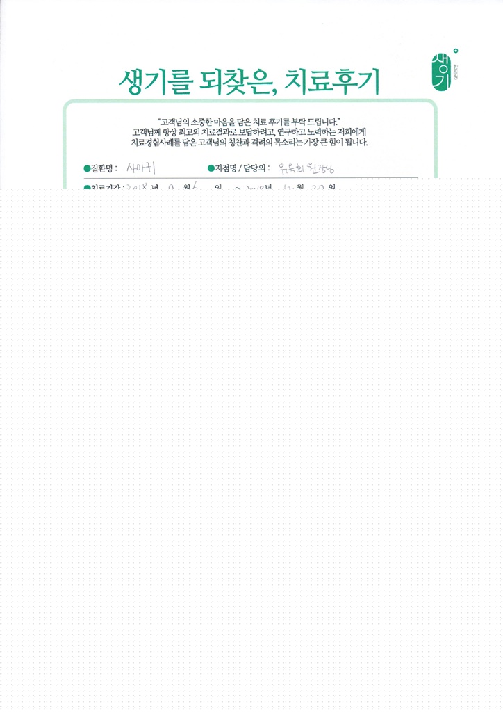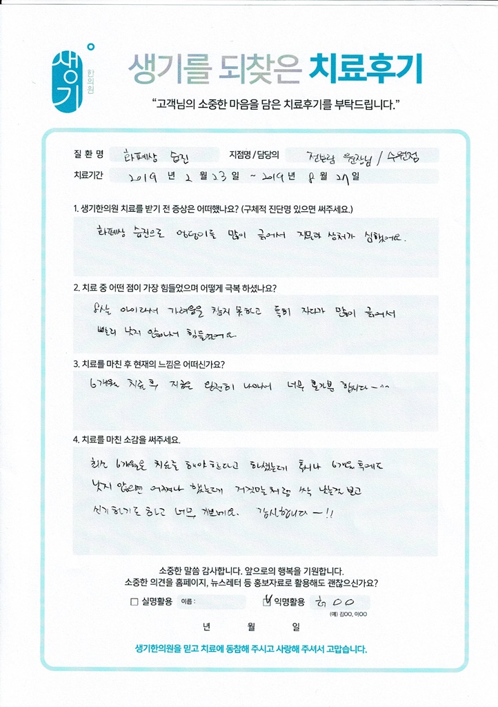 생기한의원과 함께하신 생생한 자필 및 영상 후기를 소개합니다.