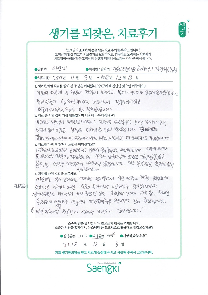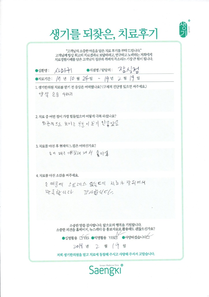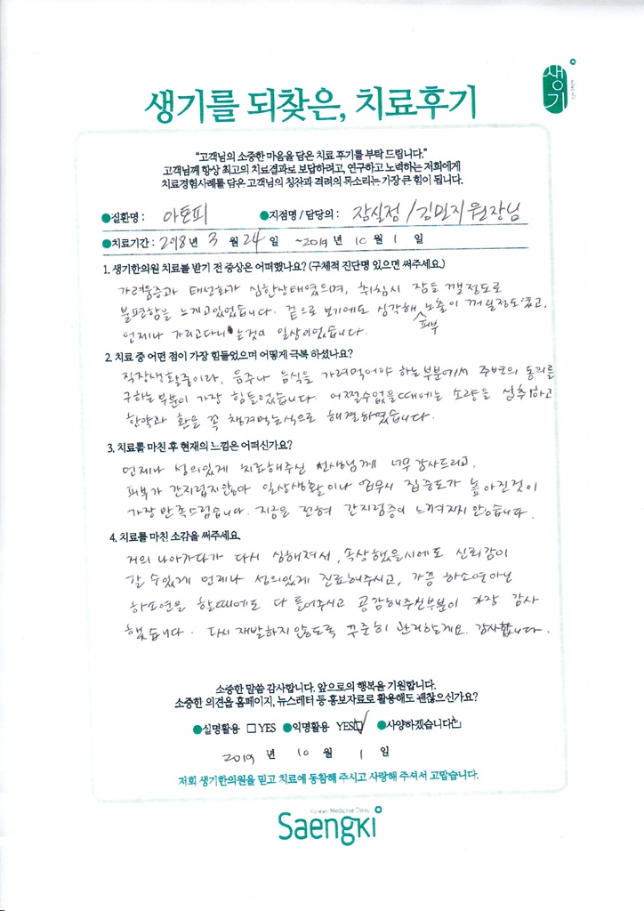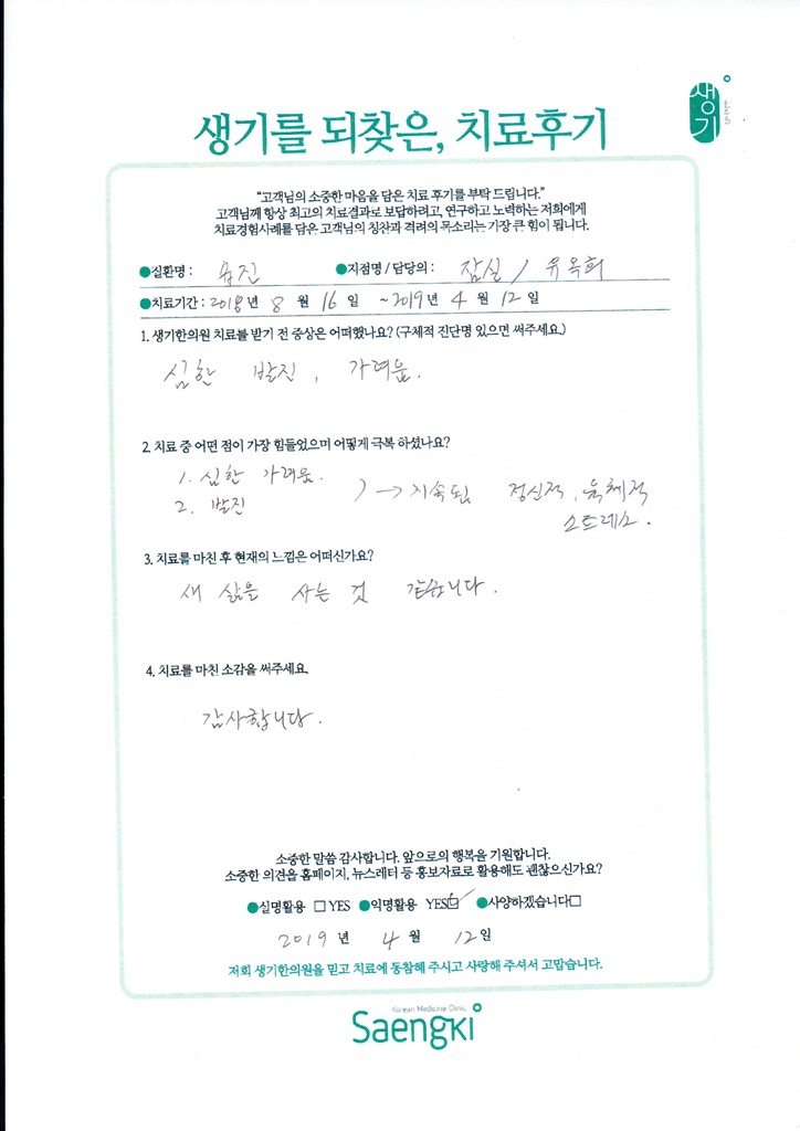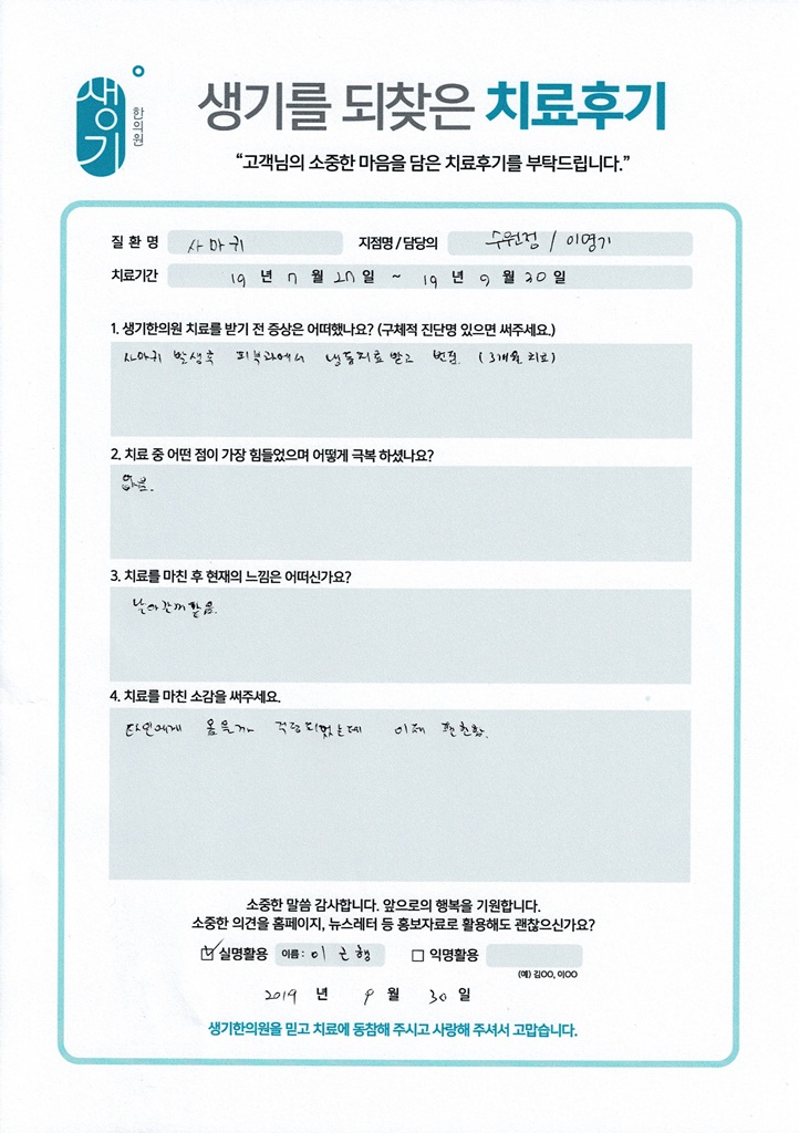 생기한의원과 함께하신 생생한 자필 및 영상 후기를 소개합니다.