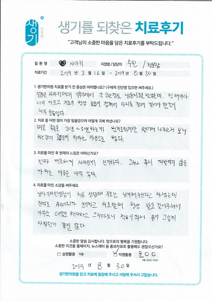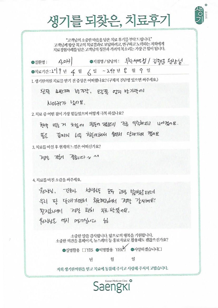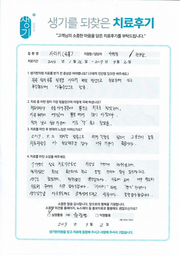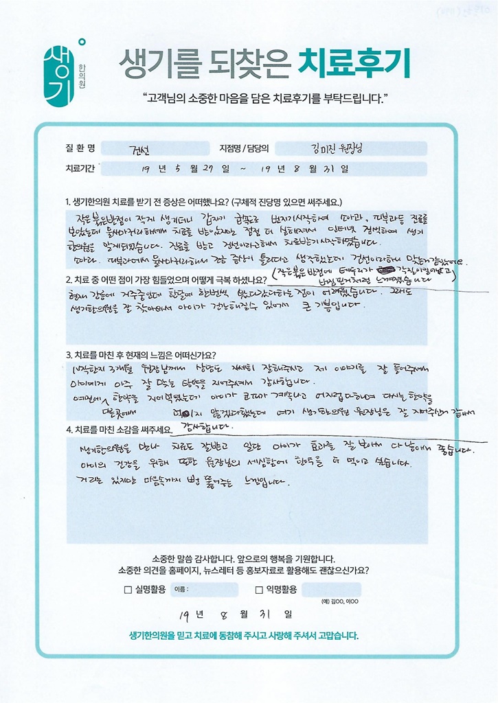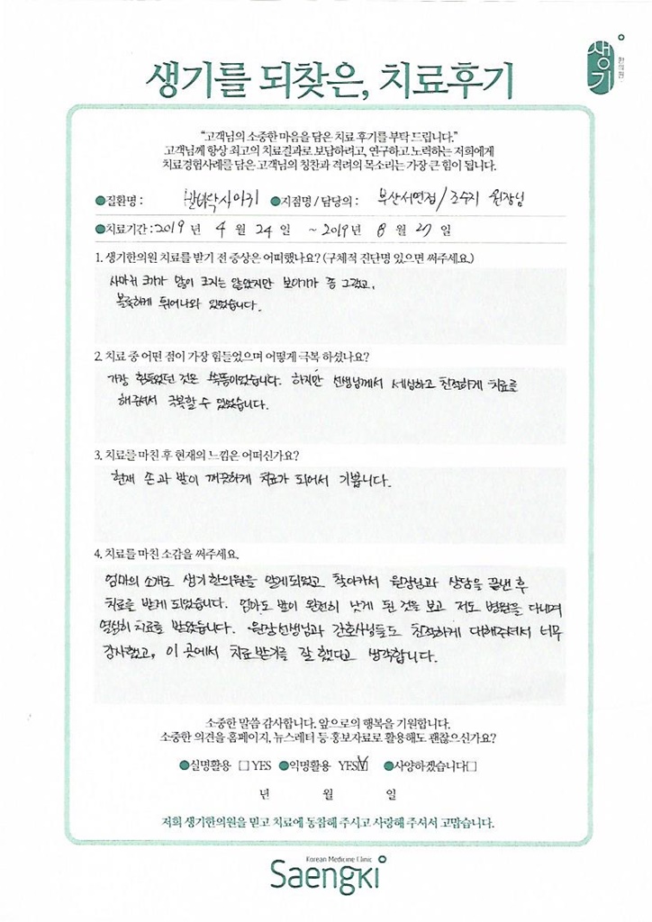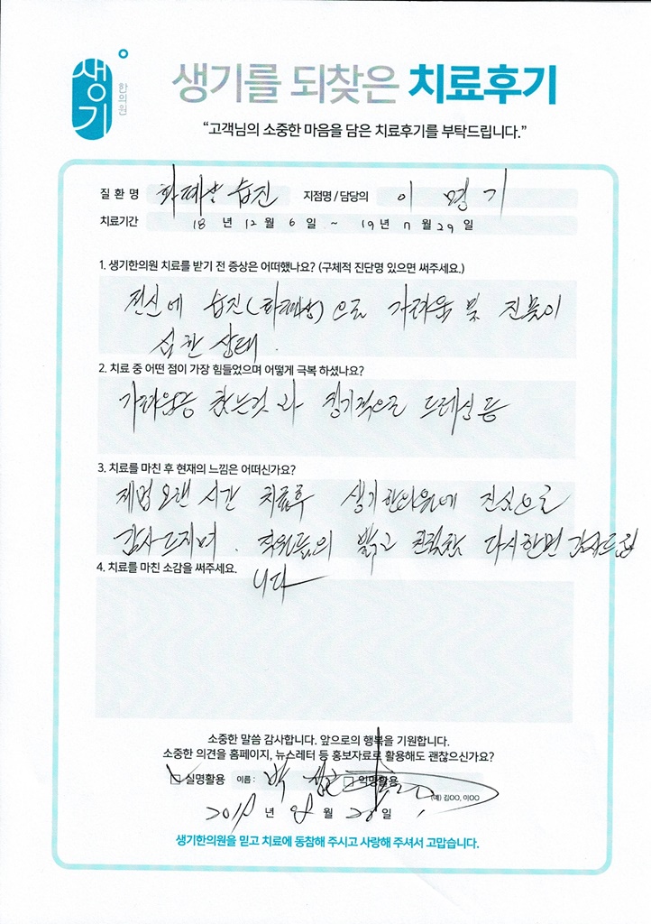 생기한의원과 함께하신 생생한 자필 및 영상 후기를 소개합니다.