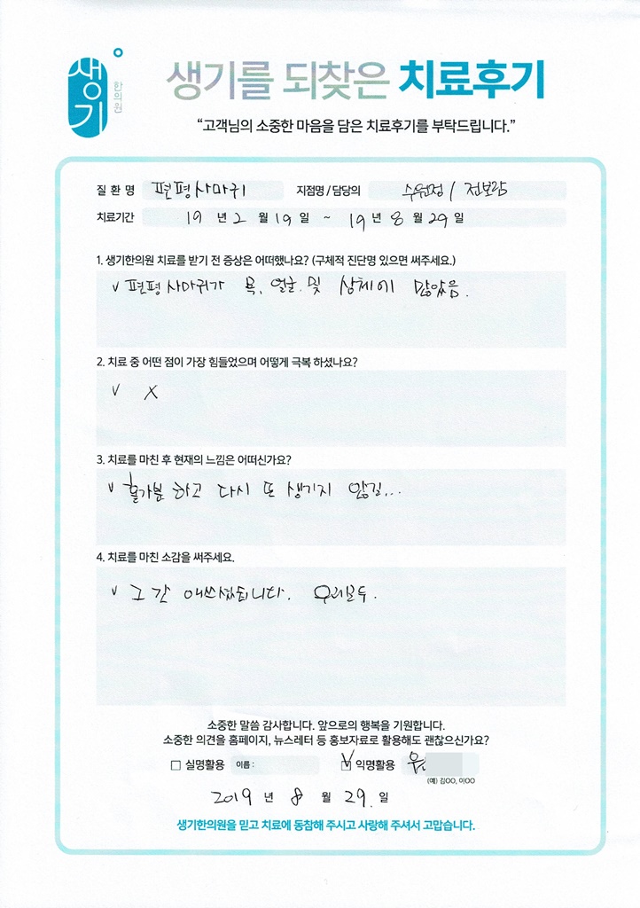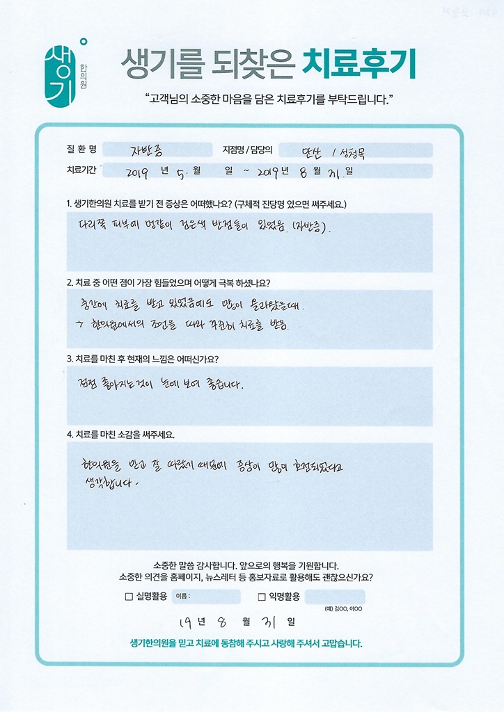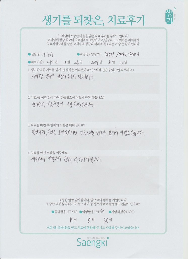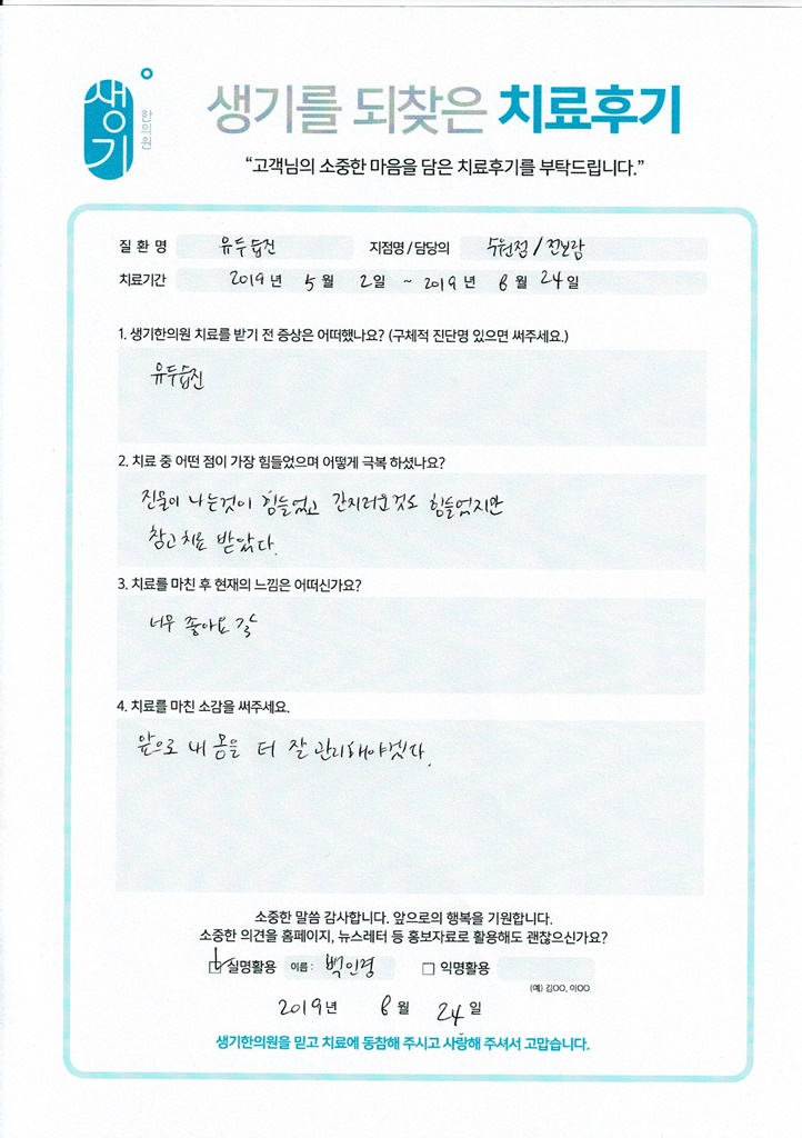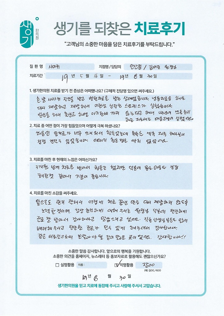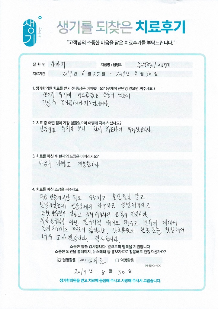 생기한의원과 함께하신 생생한 자필 및 영상 후기를 소개합니다.