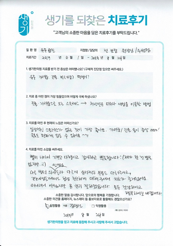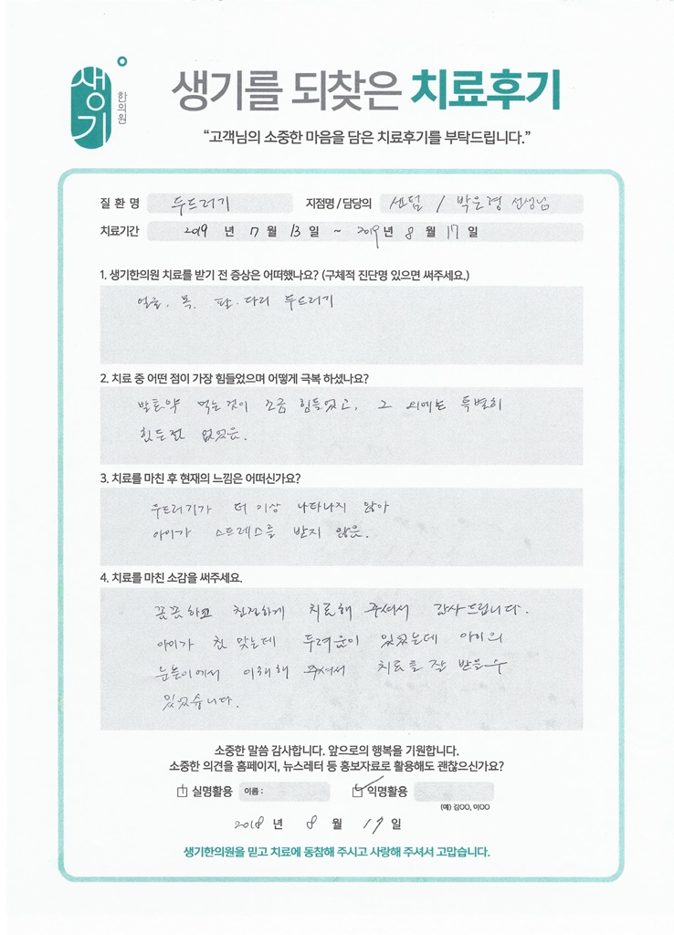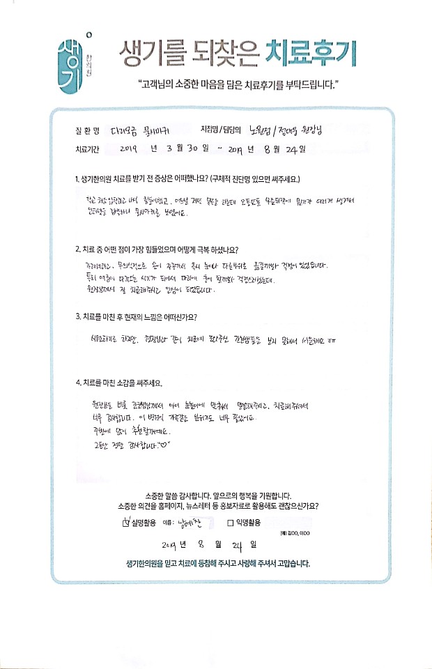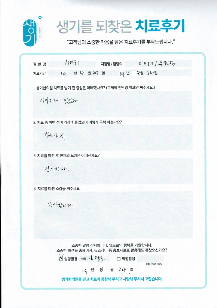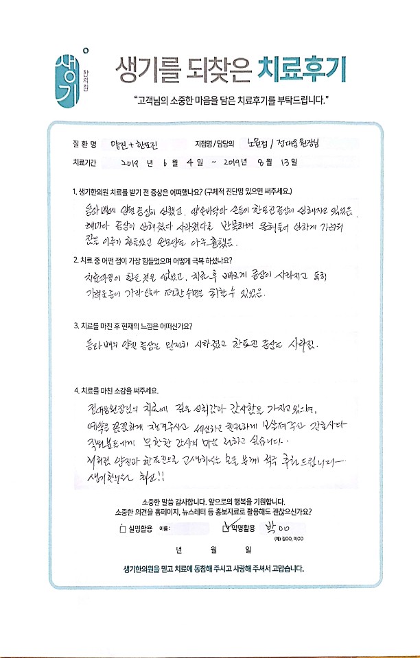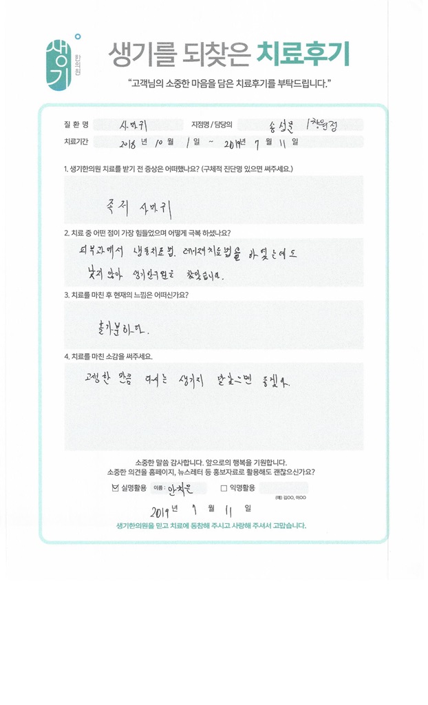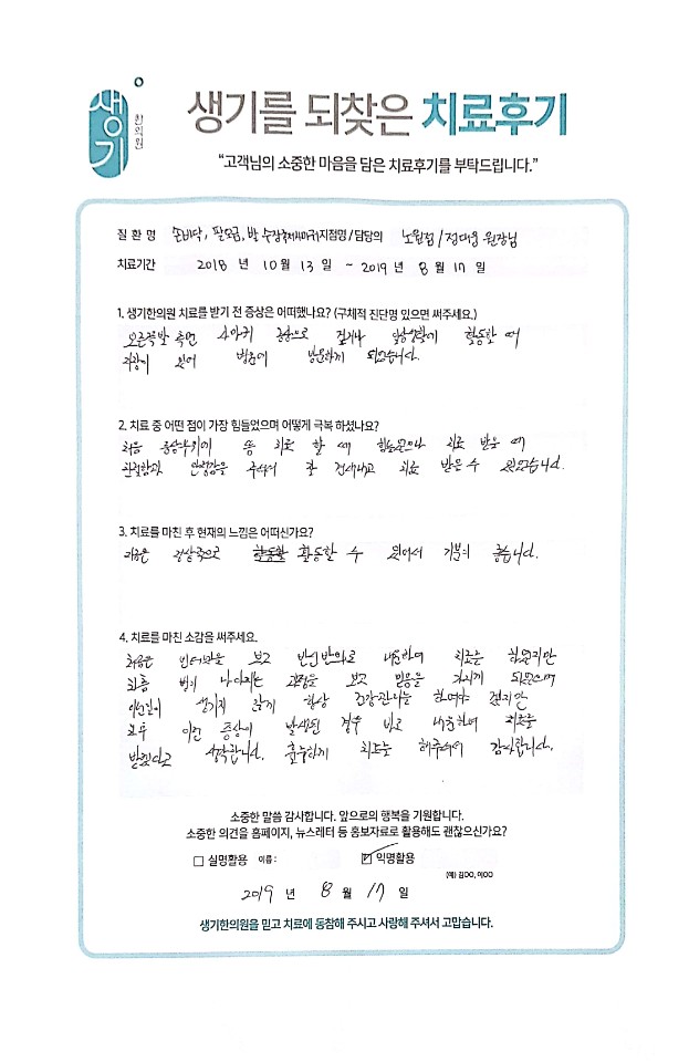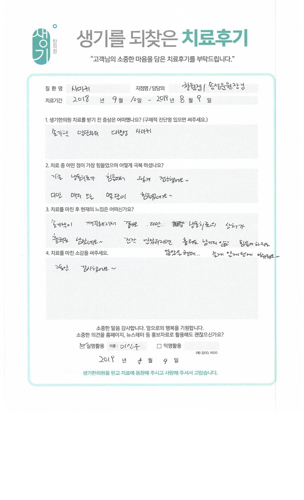 생기한의원과 함께하신 생생한 자필 및 영상 후기를 소개합니다.