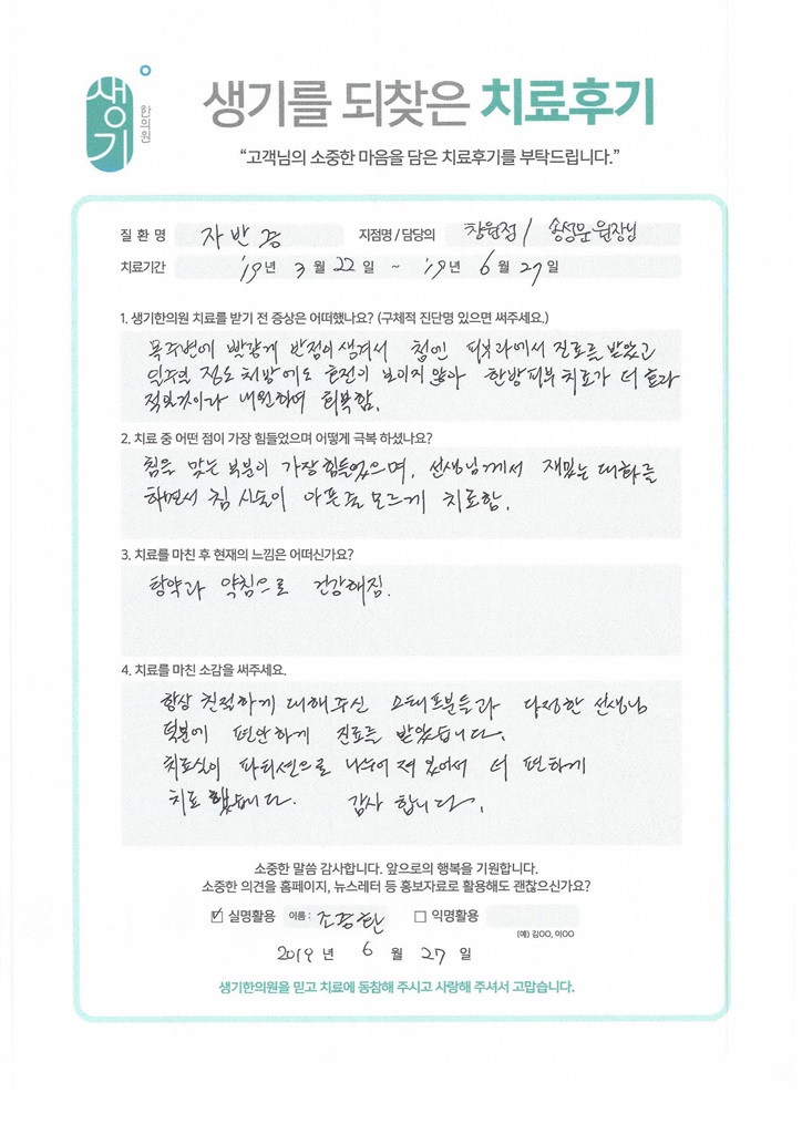 생기한의원과 함께하신 생생한 자필 및 영상 후기를 소개합니다.