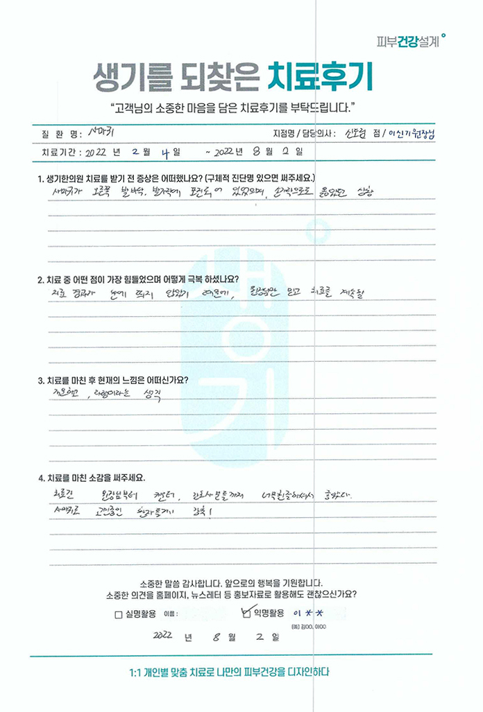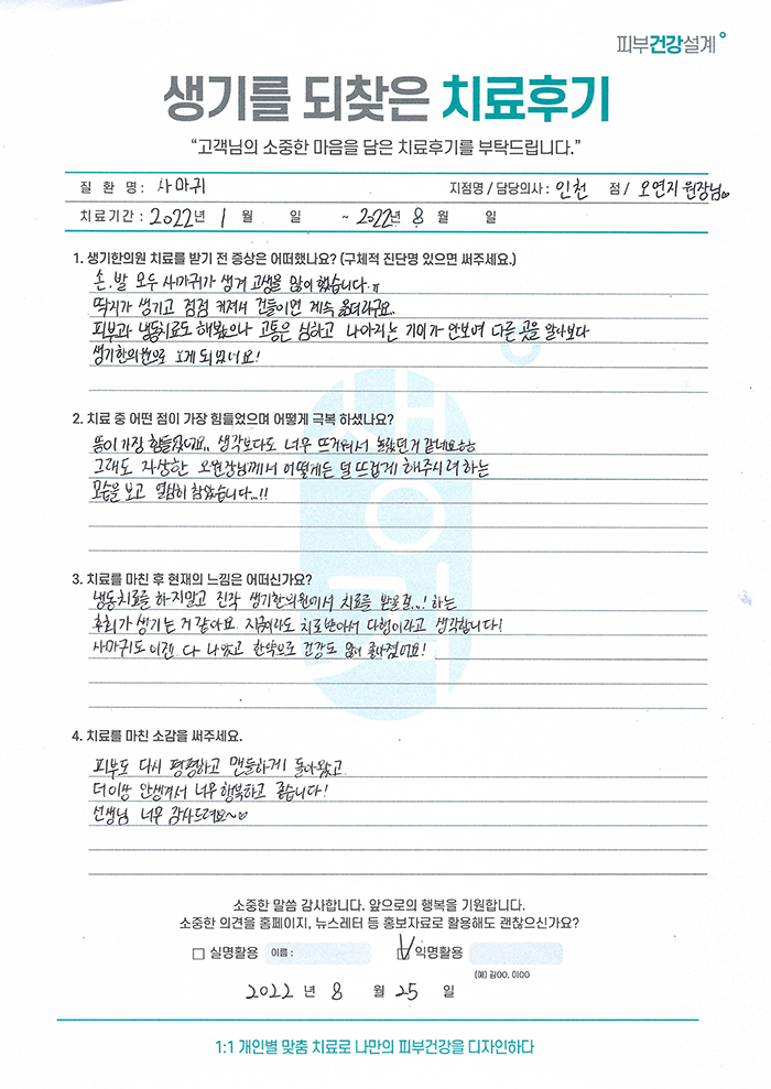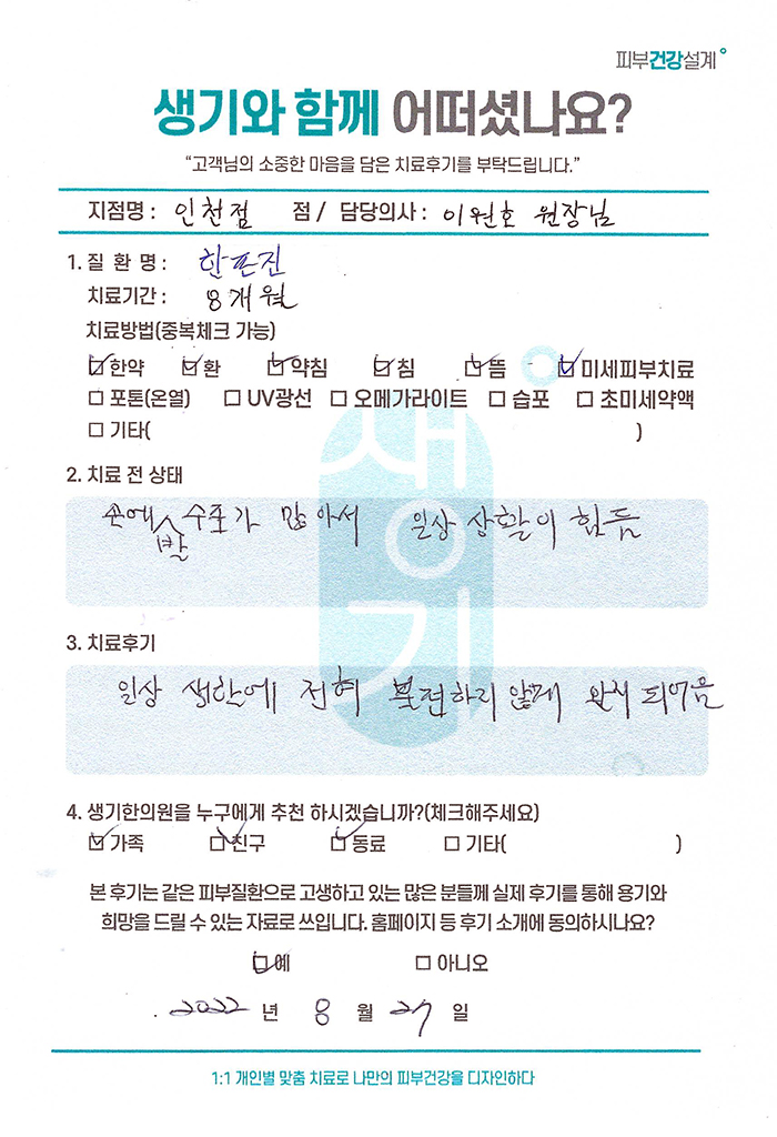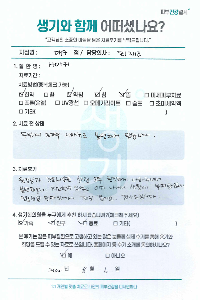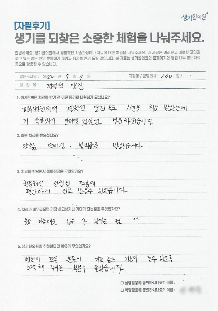 생기한의원과 함께하신 생생한 자필 및 영상 후기를 소개합니다.