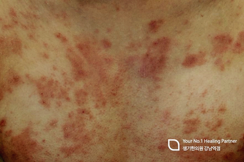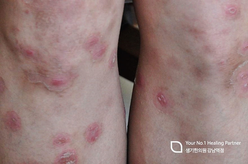 건선과는 다르게 상처 부위가 짓무르며 습진 형태의 병변이 발생하는 특징이 있습니다.